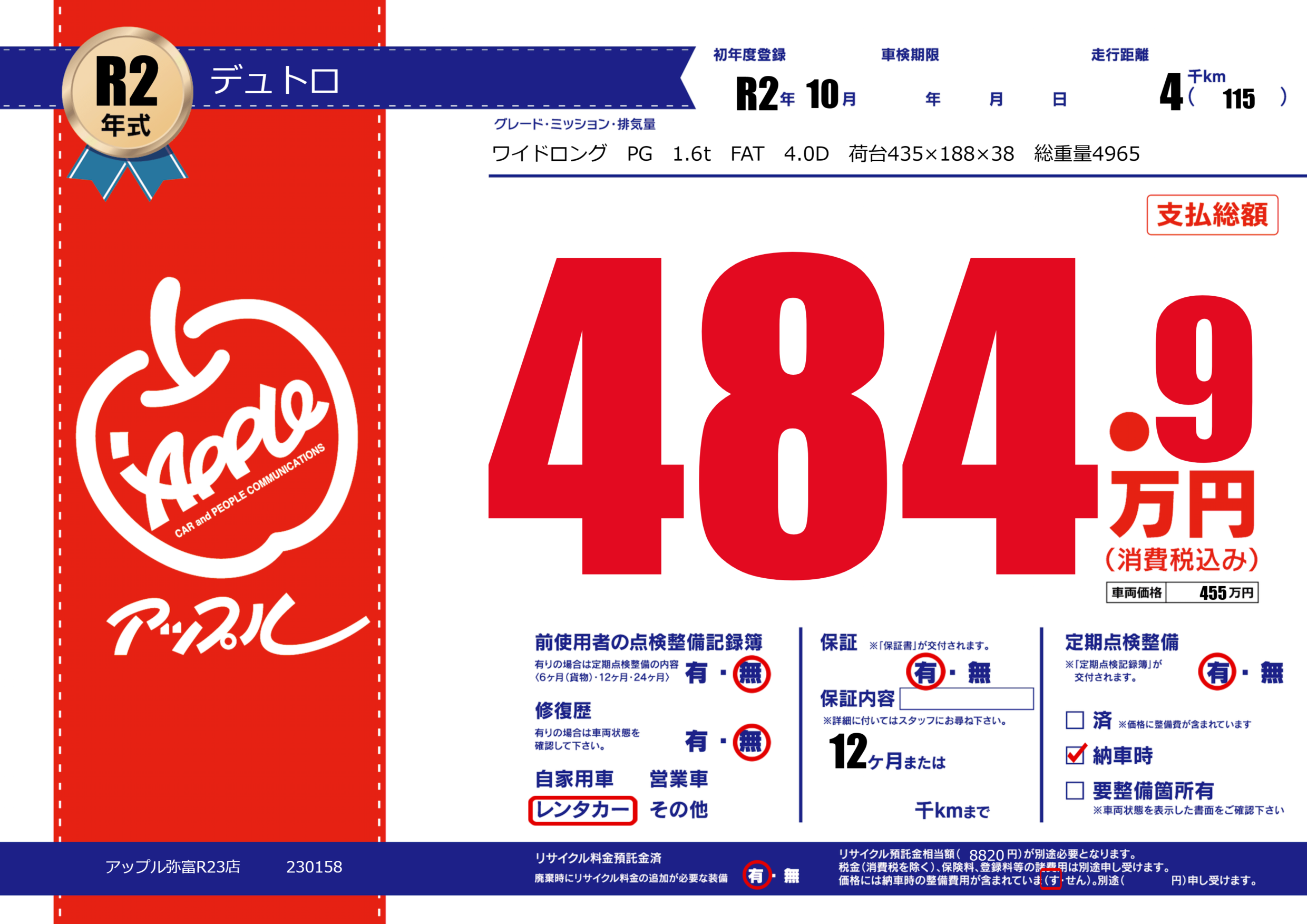 | 走行キロ | 0.4万km | 初年度登録 | R2年10月 |