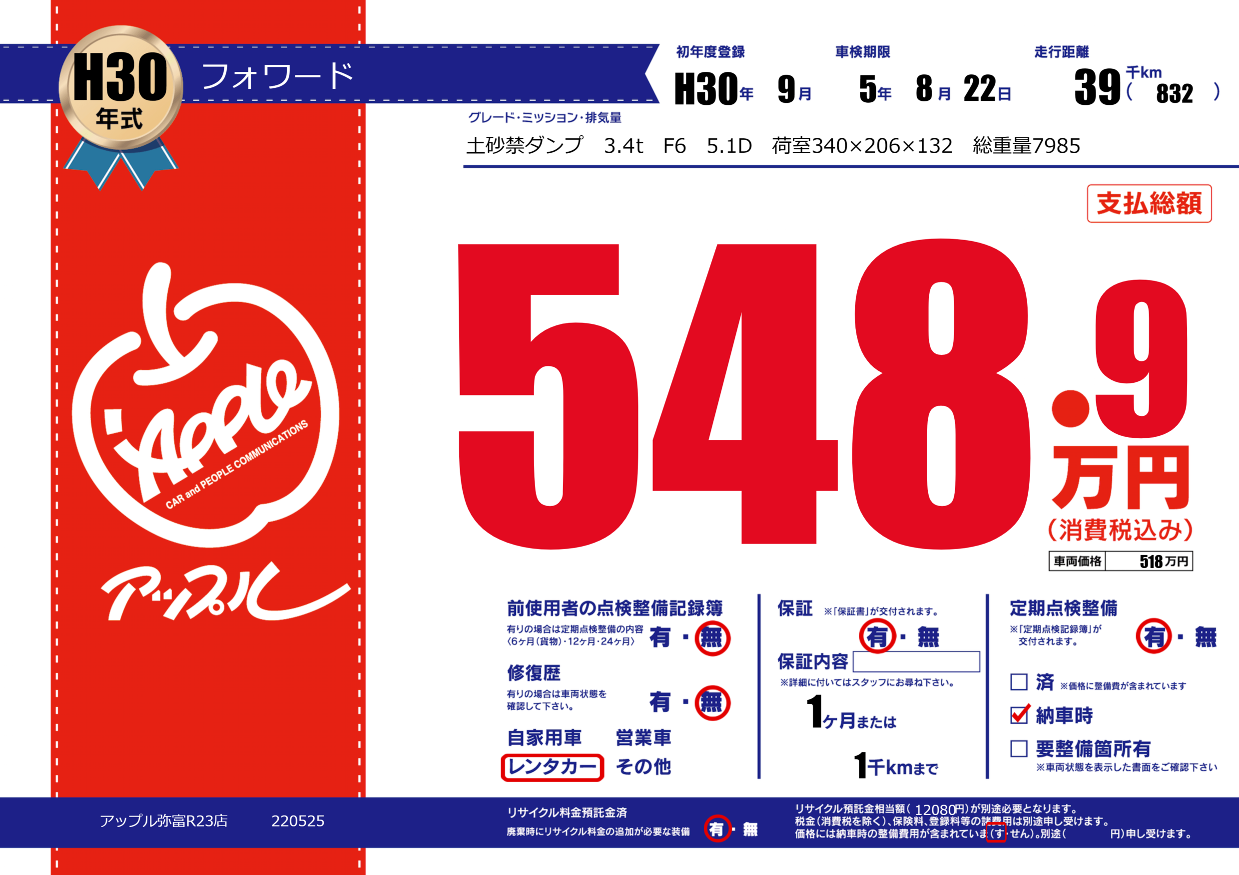 | 走行キロ | 3.9万km | 初年度登録 | H30年9月 |