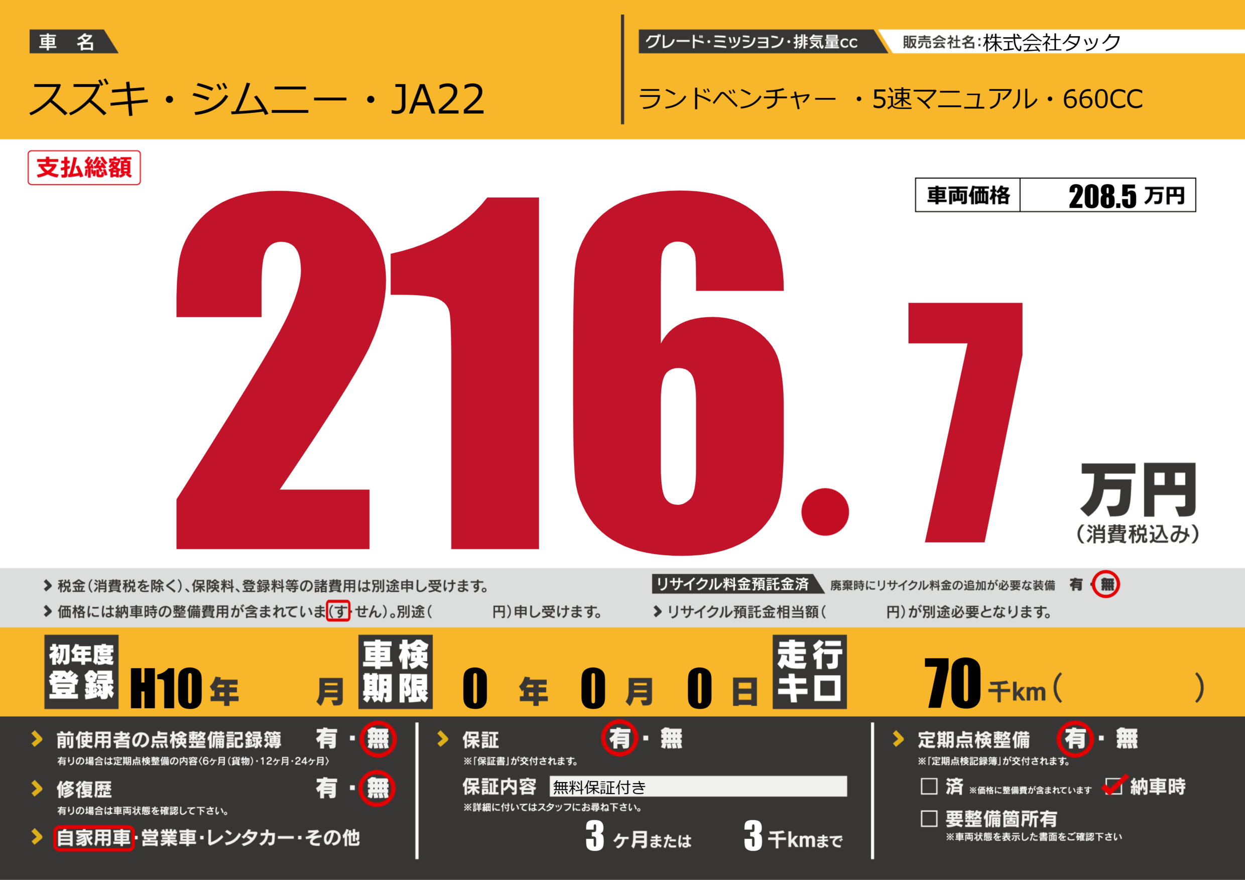 保証なし 保証内容(無料保証付き) 3ヶ月または(3)千kmまで |