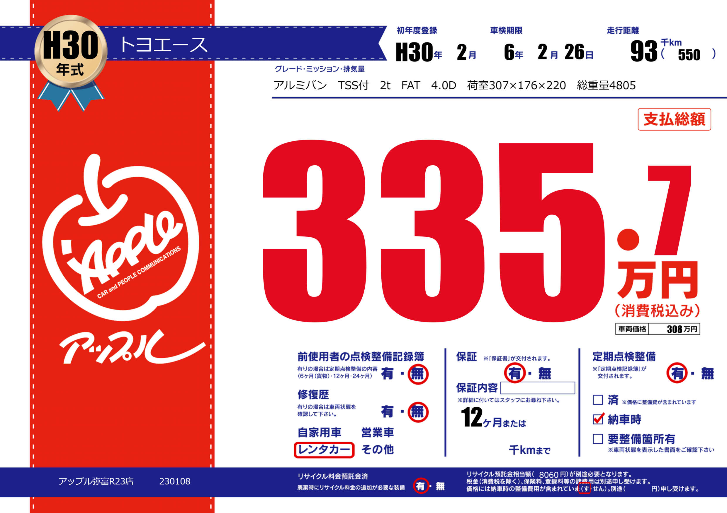 | 走行キロ | 9.3万km | 初年度登録 | H30年2月 |