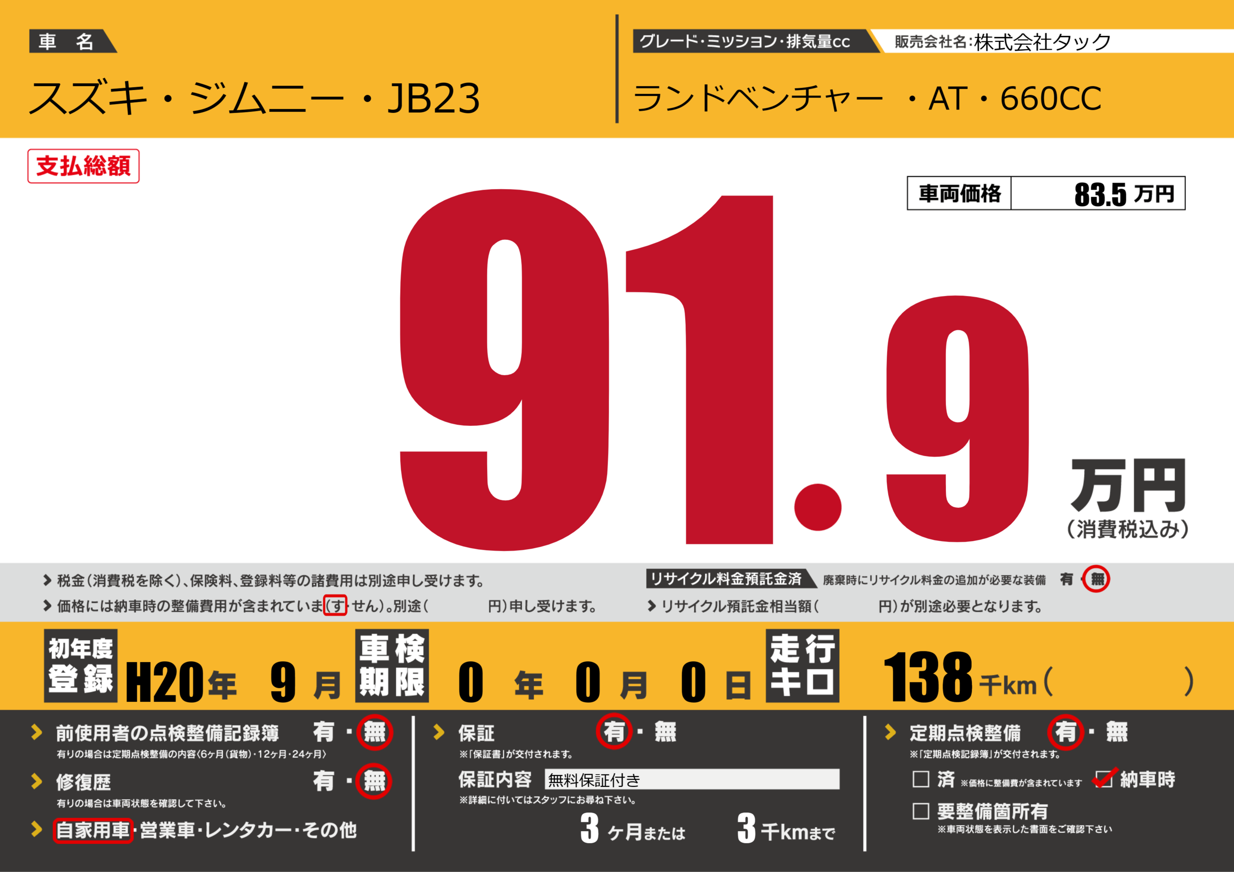 保証なし 保証内容(無料保証付き) 3ヶ月または(3)千kmまで |