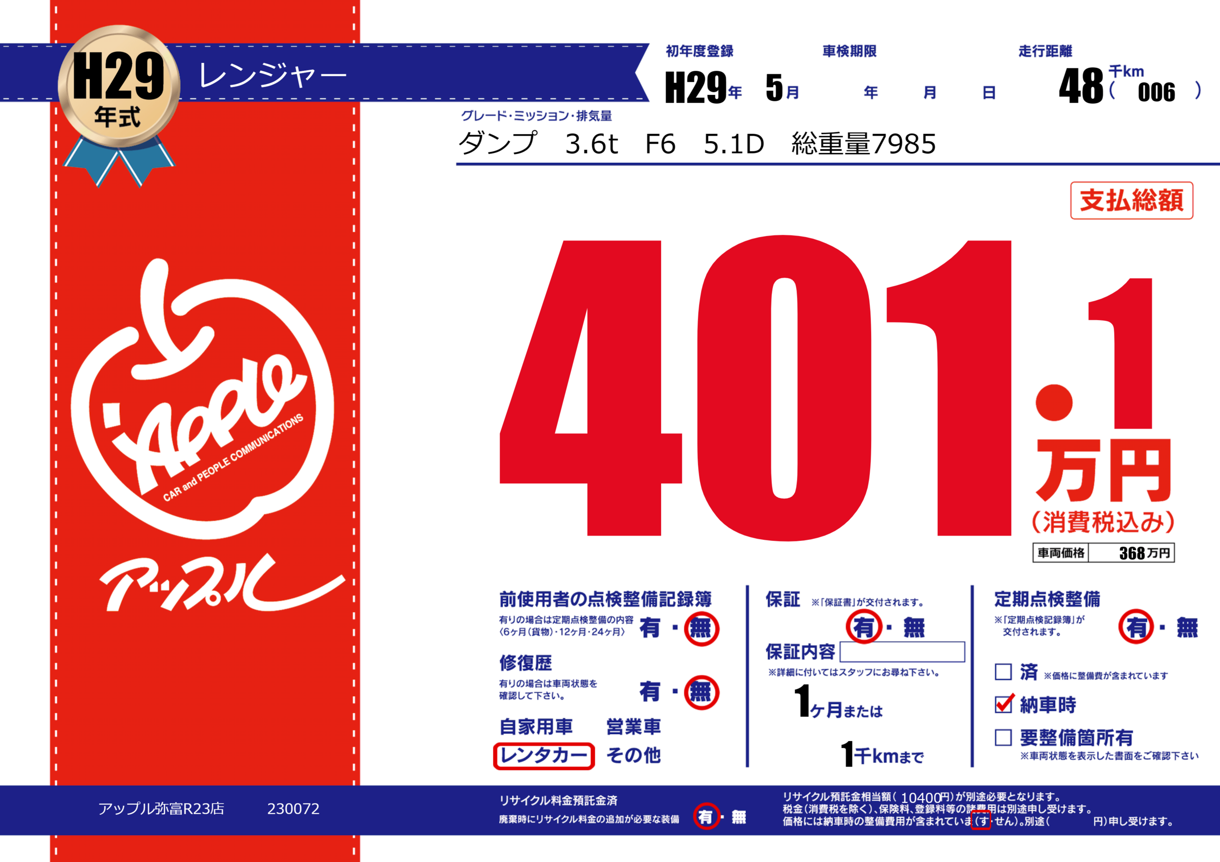 保証付き 保証内容(---) 1ヶ月または(1)千kmまで |