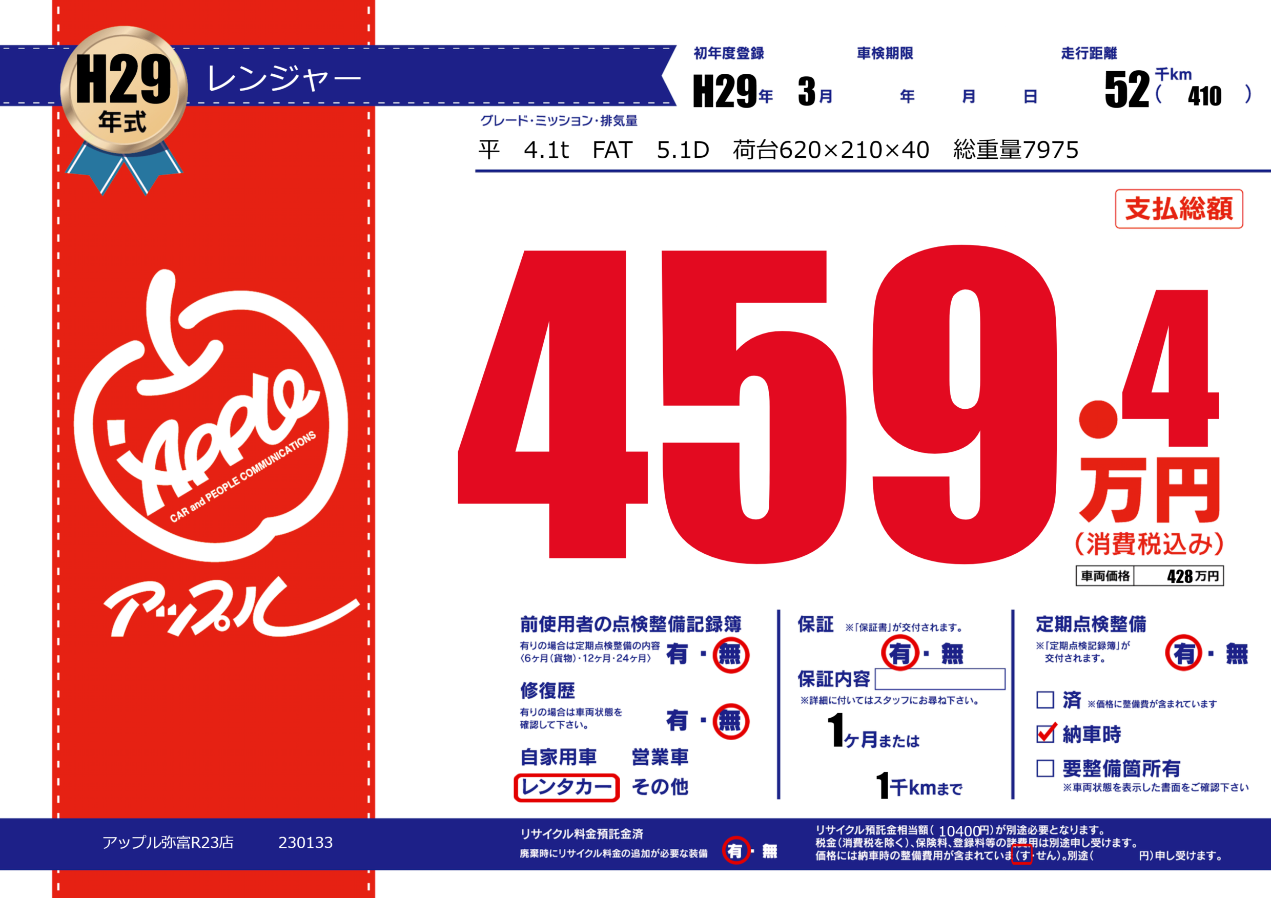 | 走行キロ | 5.2万km | 初年度登録 | H29年3月 |