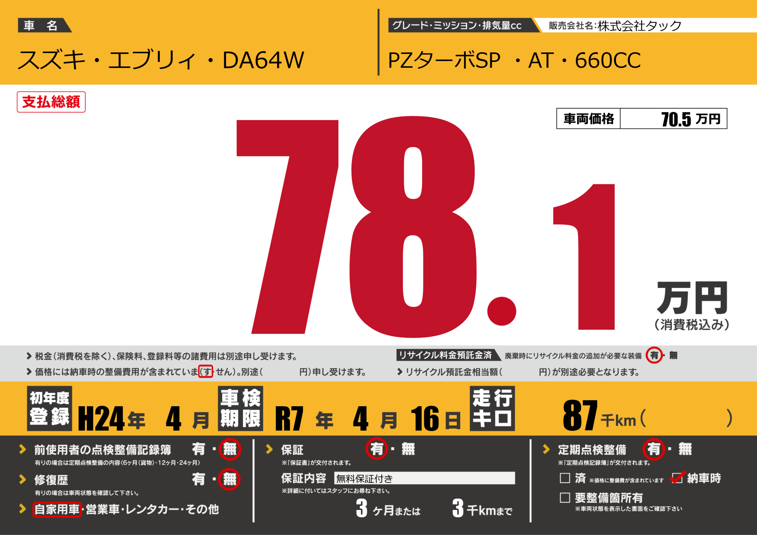 保証なし 保証内容(無料保証付き) 3ヶ月または(3)千kmまで |