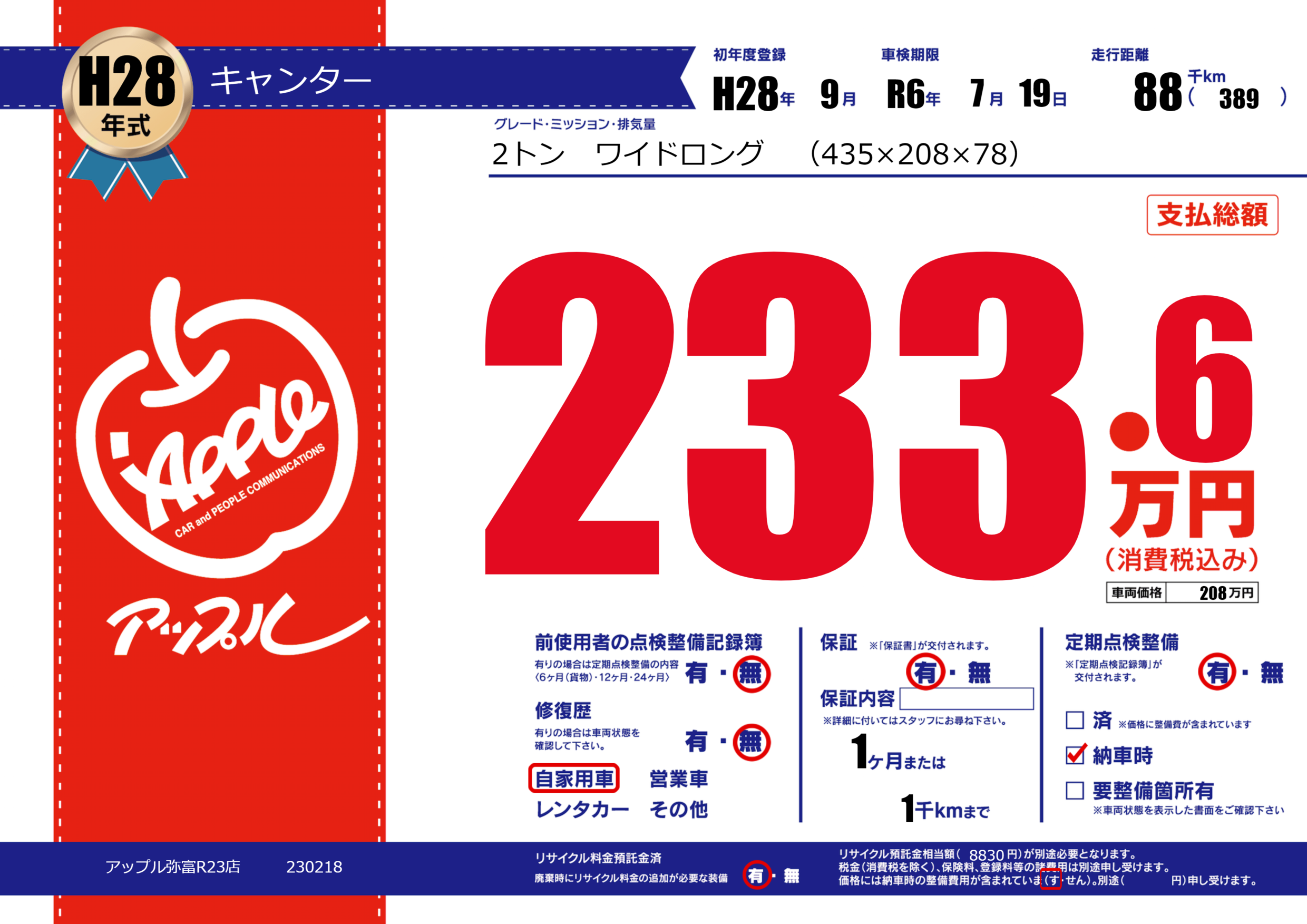 | 車名 | キャンター | グレード ミッション 排気量 |