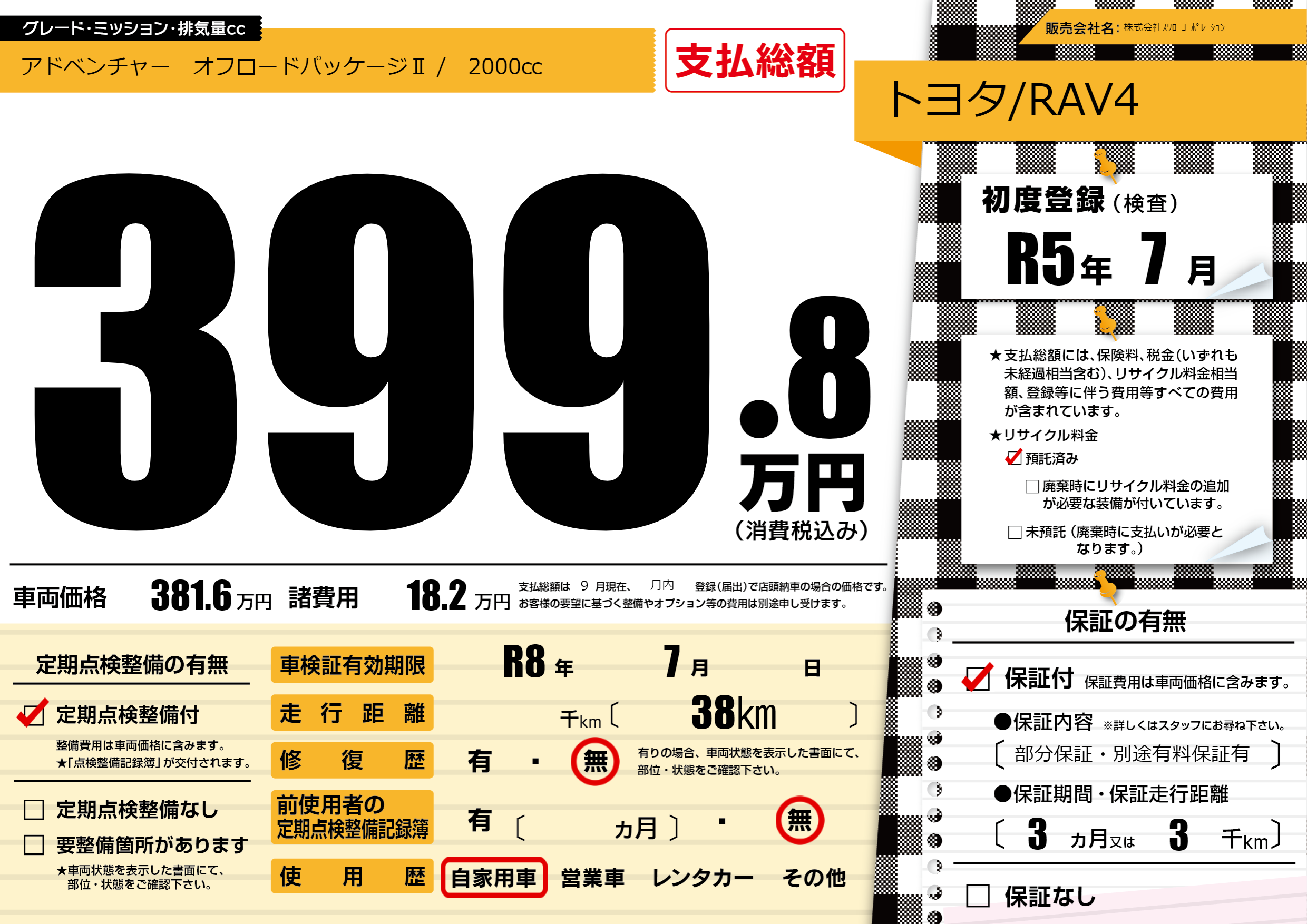 保証付き 保証内容(部分保証・別途有料保証有) 3ヶ月または(3)千kmまで |