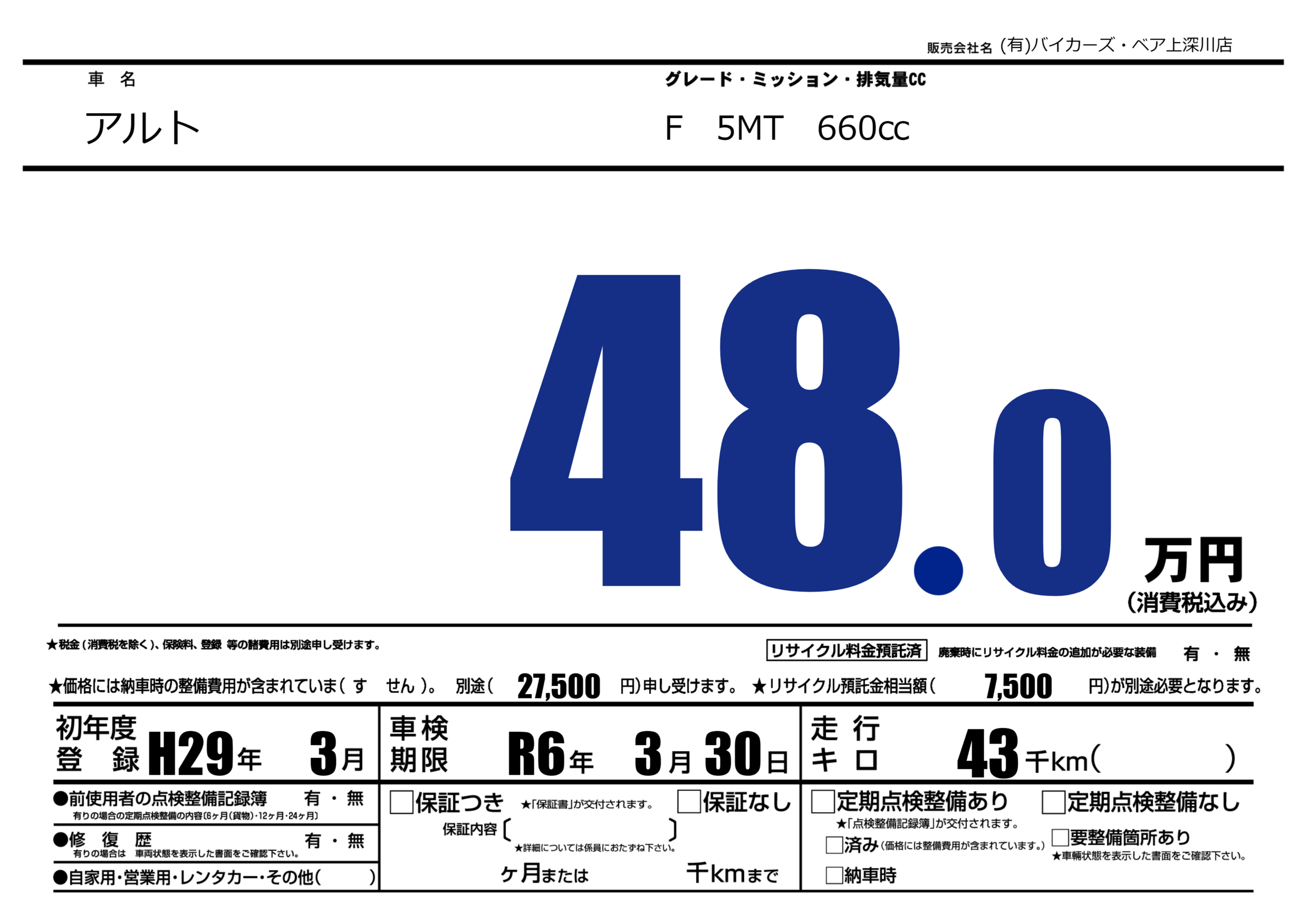 | 車検制限 | R6年 3月 30日 | ||