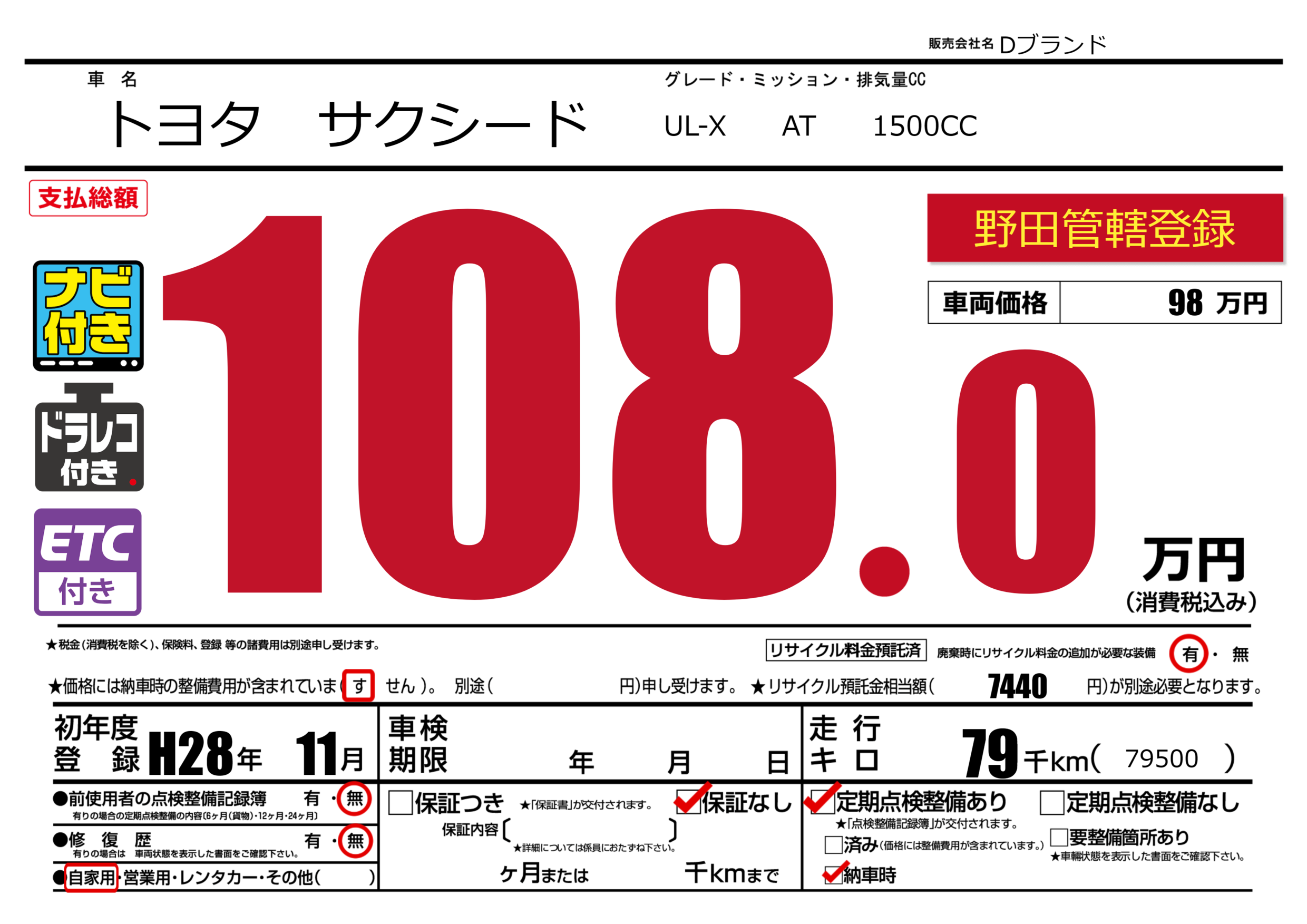 | 車名 | トヨタ サクシード | グレード ミッション 排気量 |