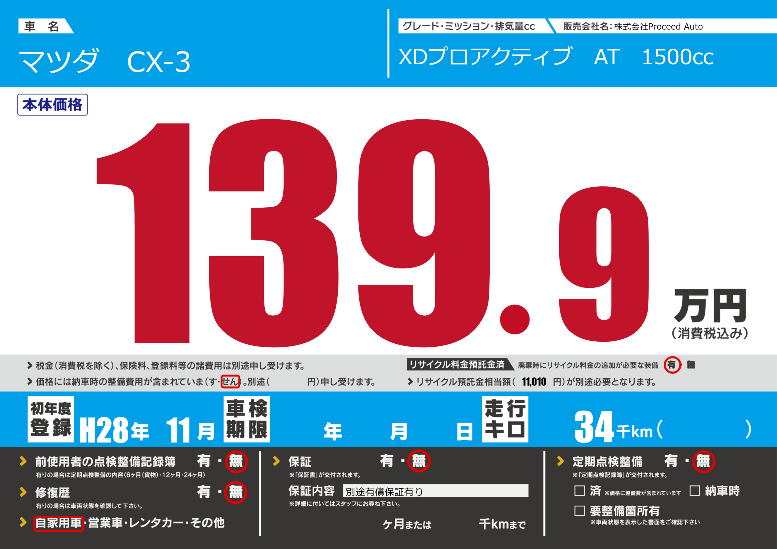 保証なし 保証内容(別途有償保証有り) ---ヶ月または()千kmまで |