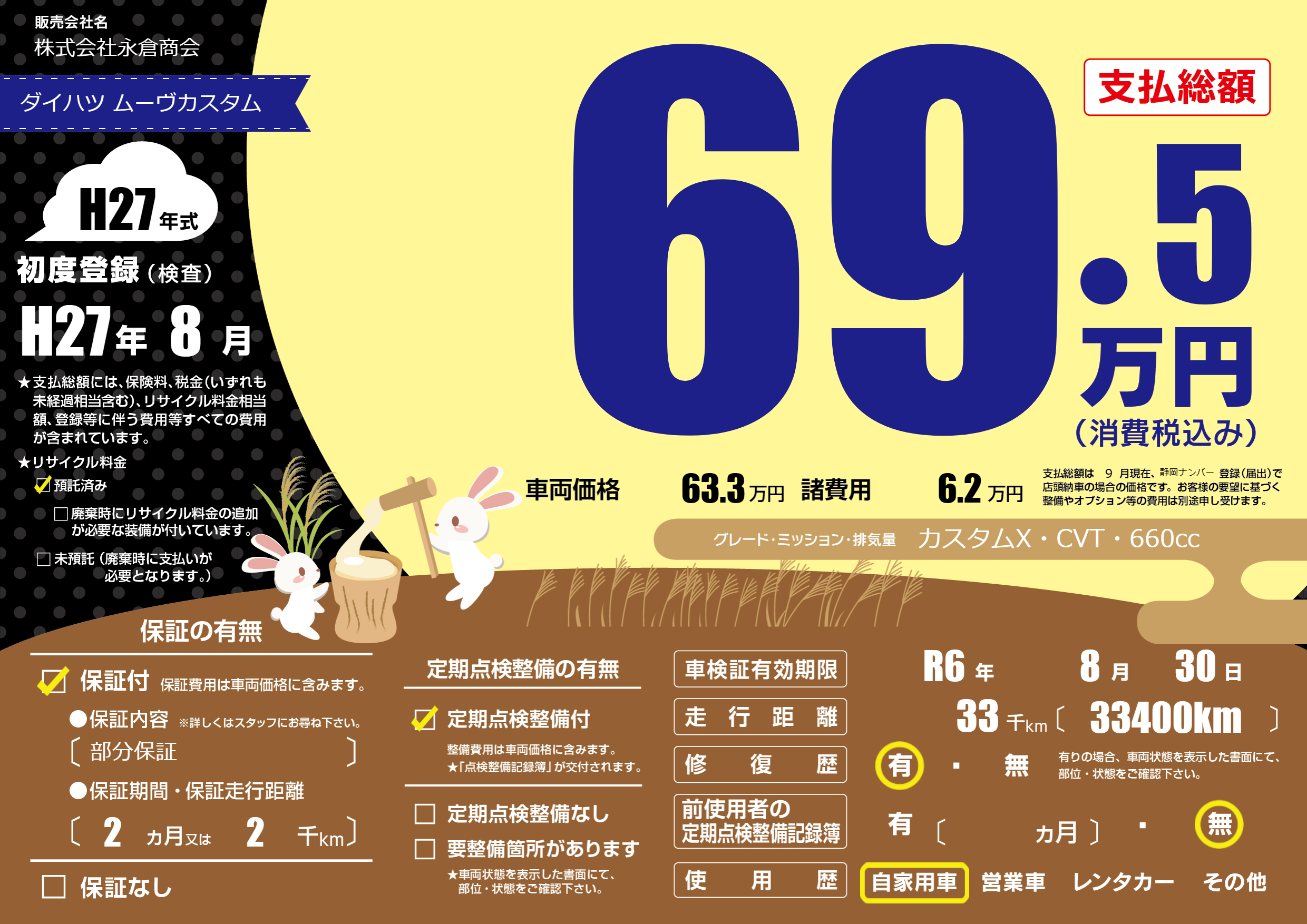 | 走行キロ | 3.3万km | 初年度登録 | H27年8月 |