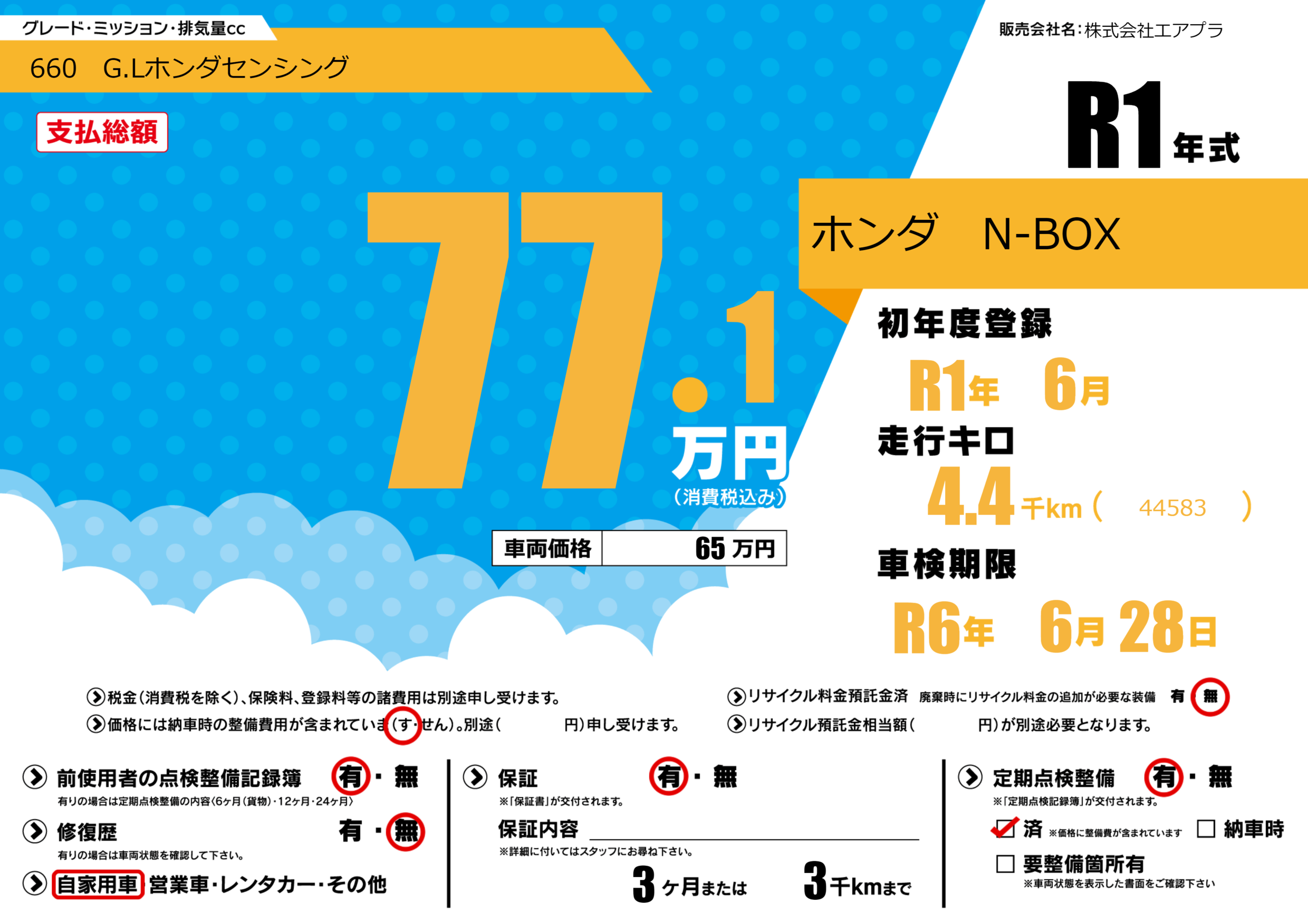 | 定期点検整備 | 定期点検整備あり 定期点検整備済み | ||
