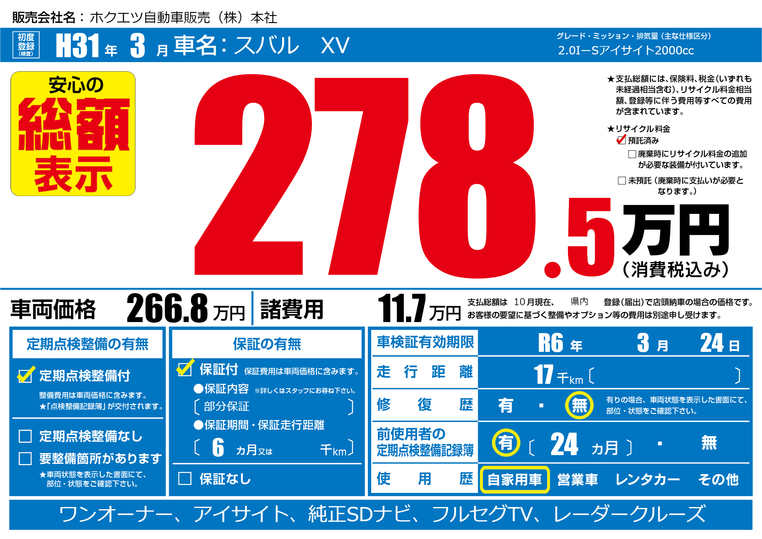 | 車名 | スバル XV | グレード ミッション 排気量 |