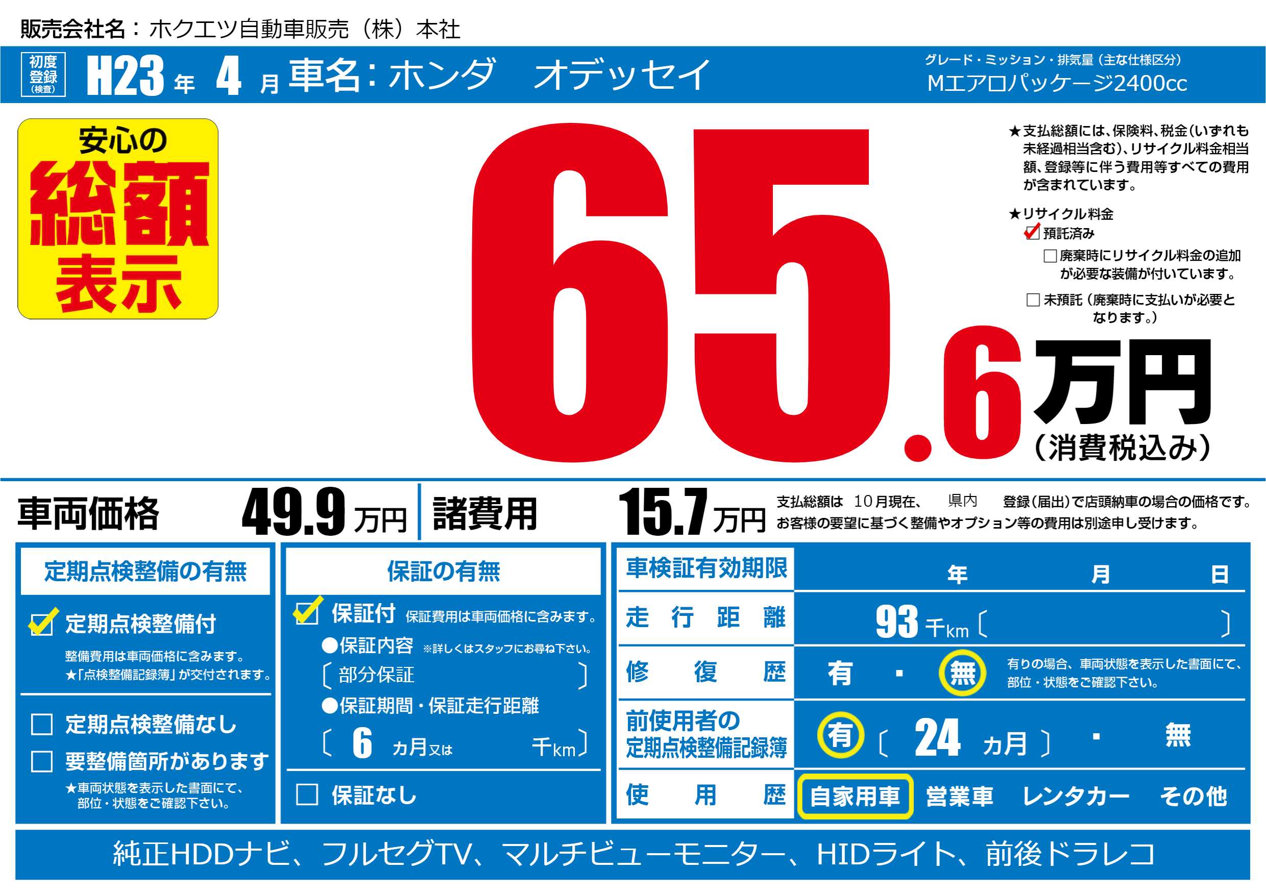 | 走行キロ | 9.3万km | 初年度登録 | H23年4月 |