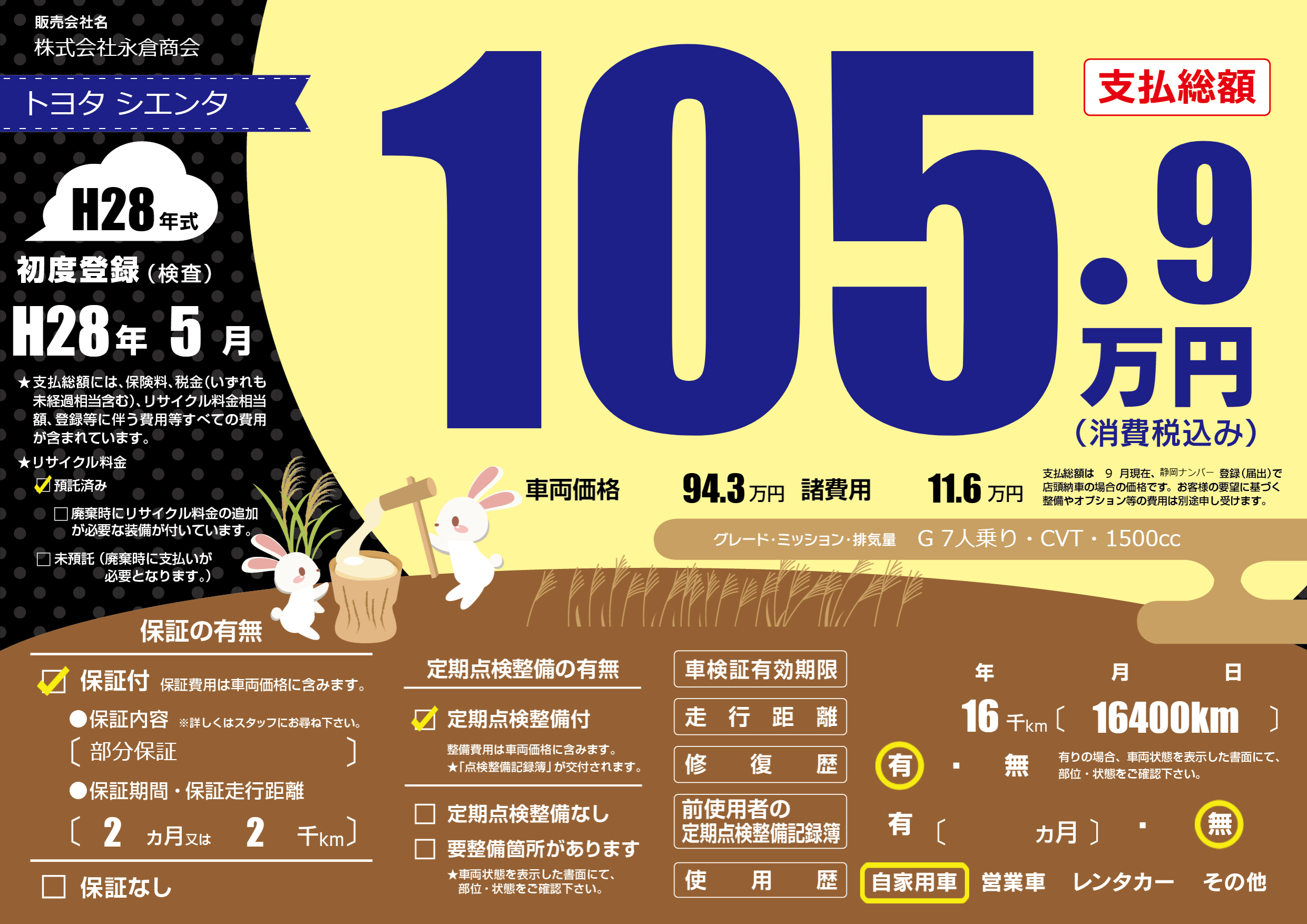 | 車名 | トヨタ シエンタ | グレード ミッション 排気量 |
