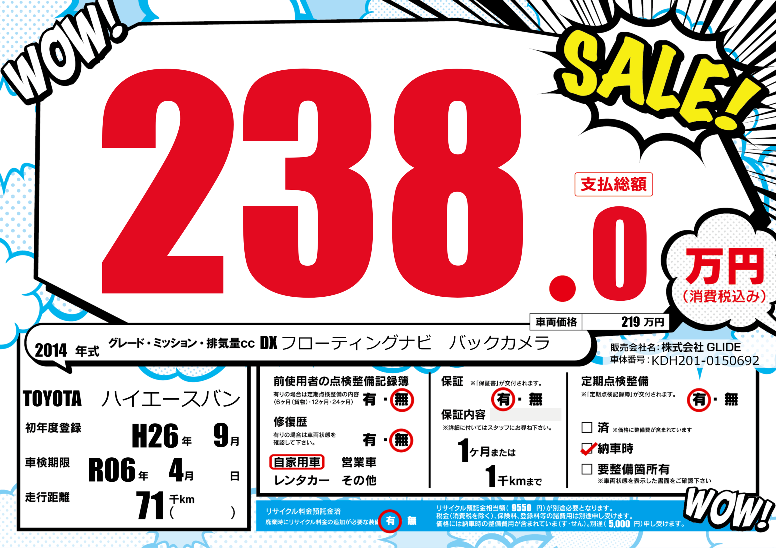 | 車名 | TOYOTA ハイエースバン | グレード ミッション 排気量 |