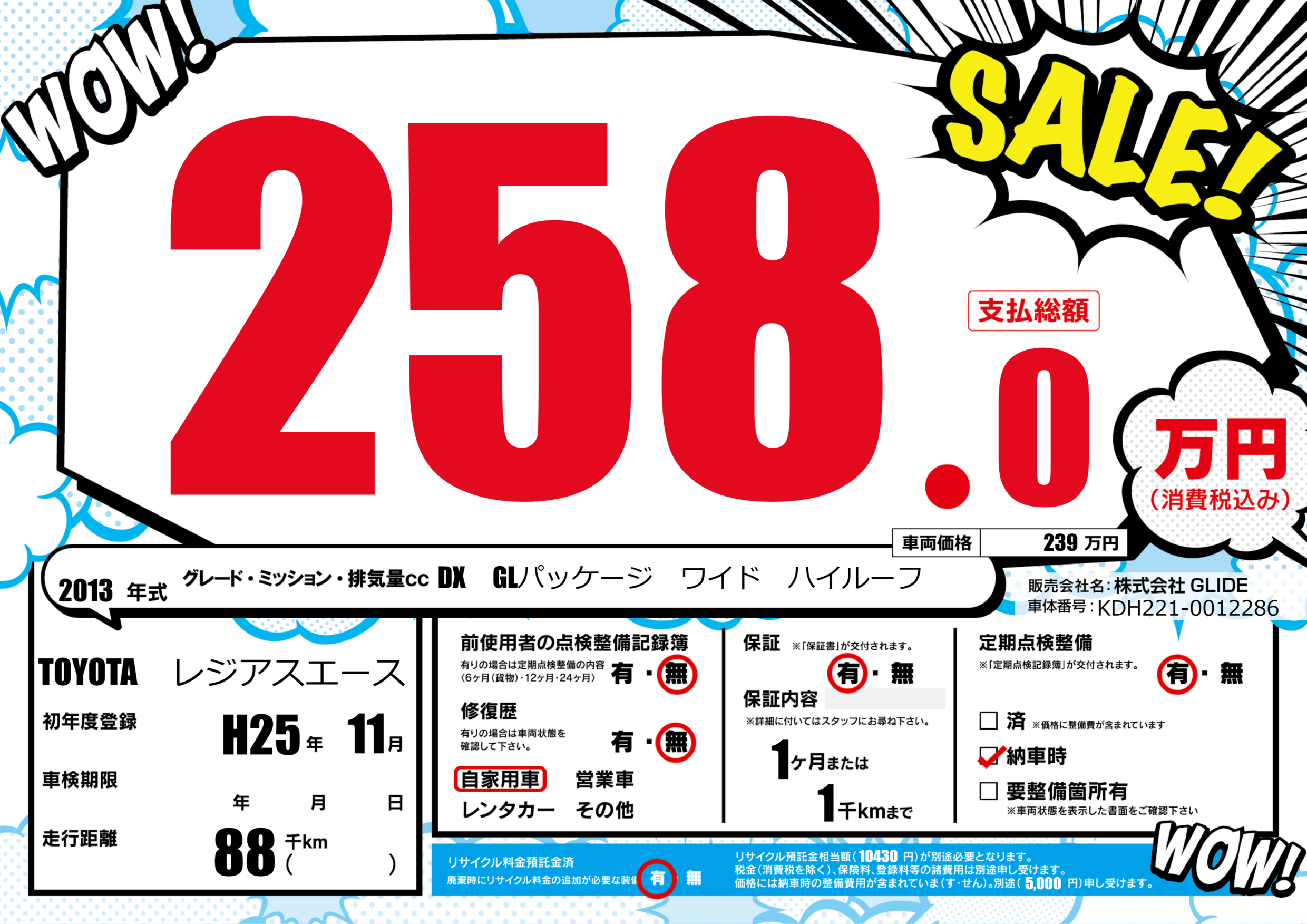 | 車名 | TOYOTA レジアスエース | グレード ミッション 排気量 |