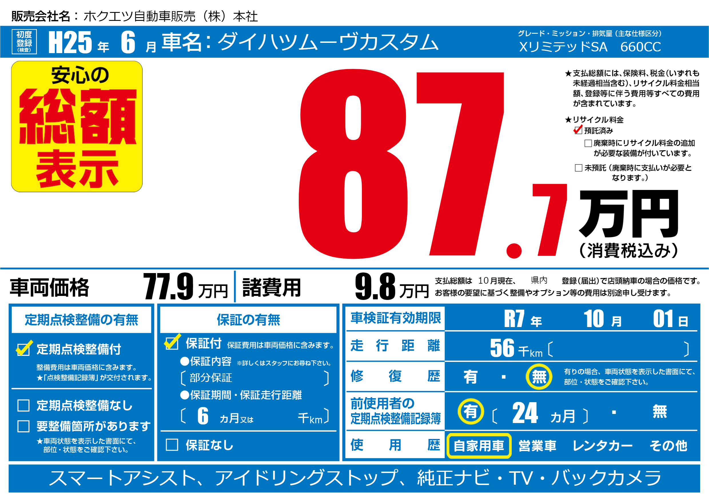 | 走行キロ | 5.6万km | 初年度登録 | H25年6月 |