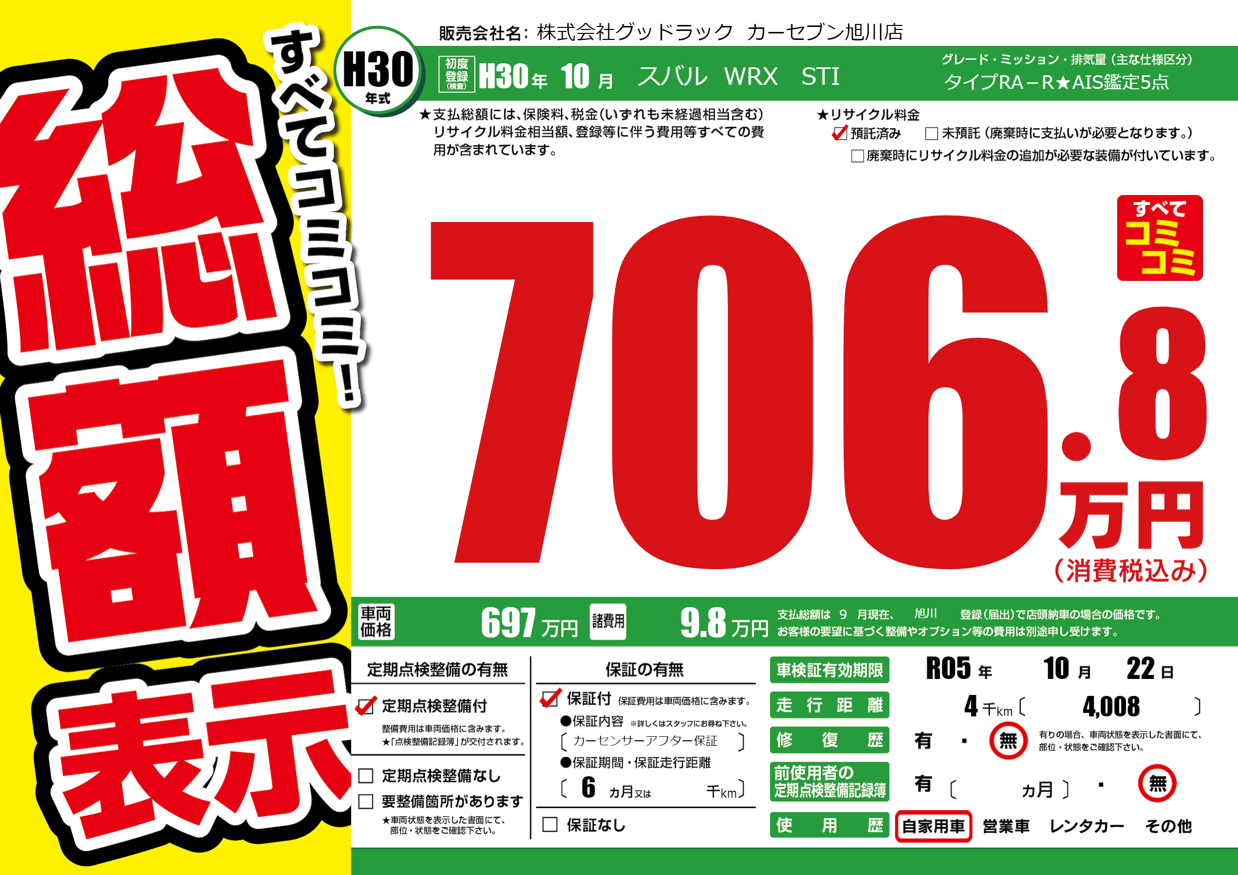 | 車名 | スバル WRX STI | グレード ミッション 排気量 |