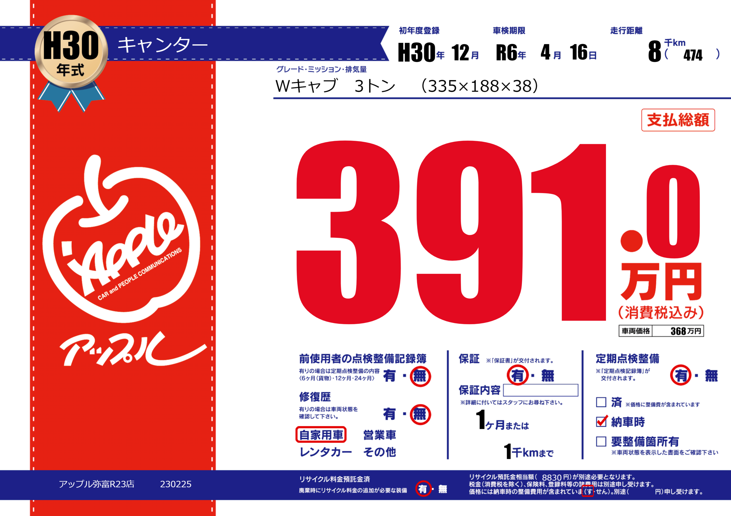 | 走行キロ | 0.8万km | 初年度登録 | H30年12月 |