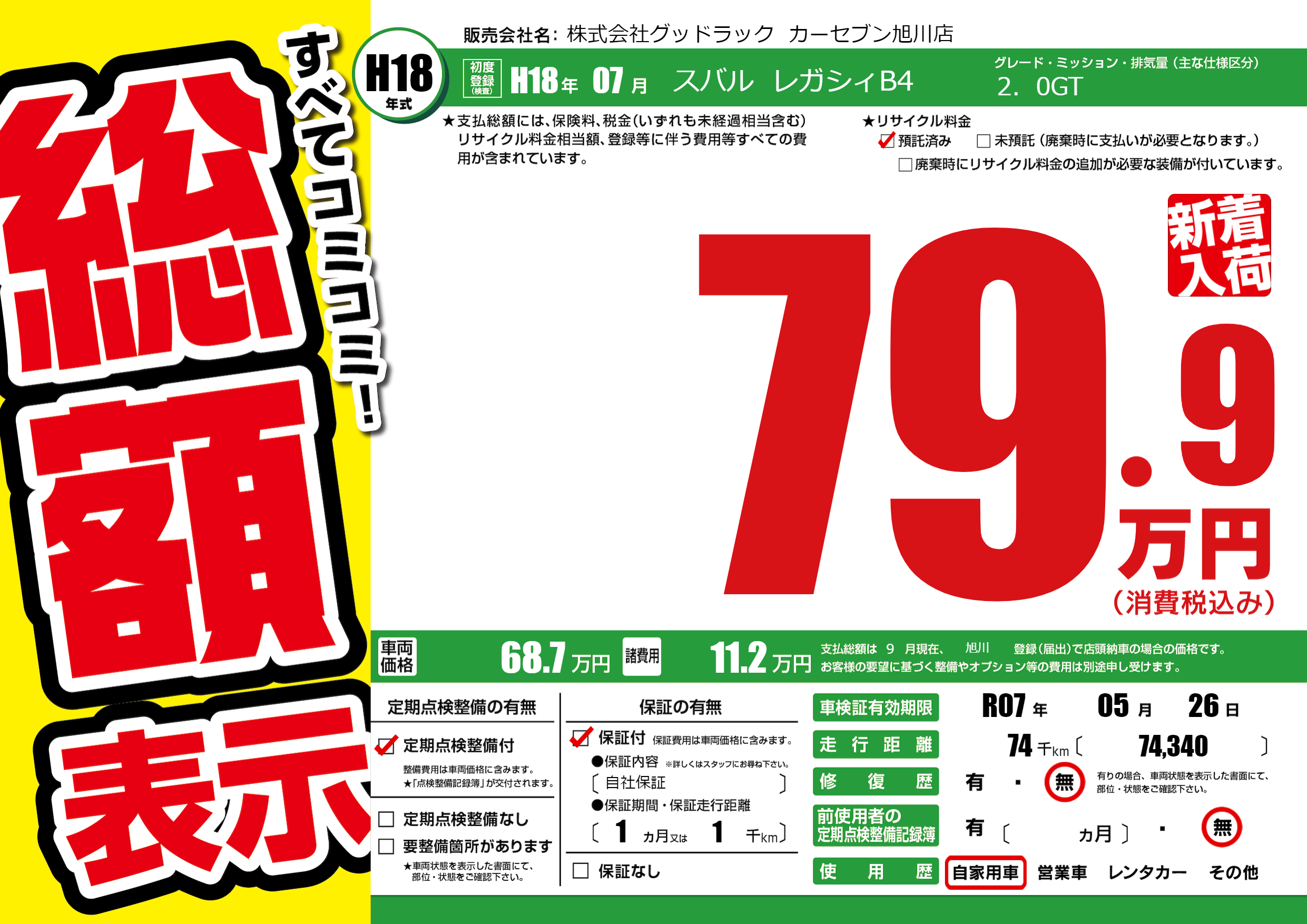 | 車名 | スバル レガシィB4 | グレード ミッション 排気量 |