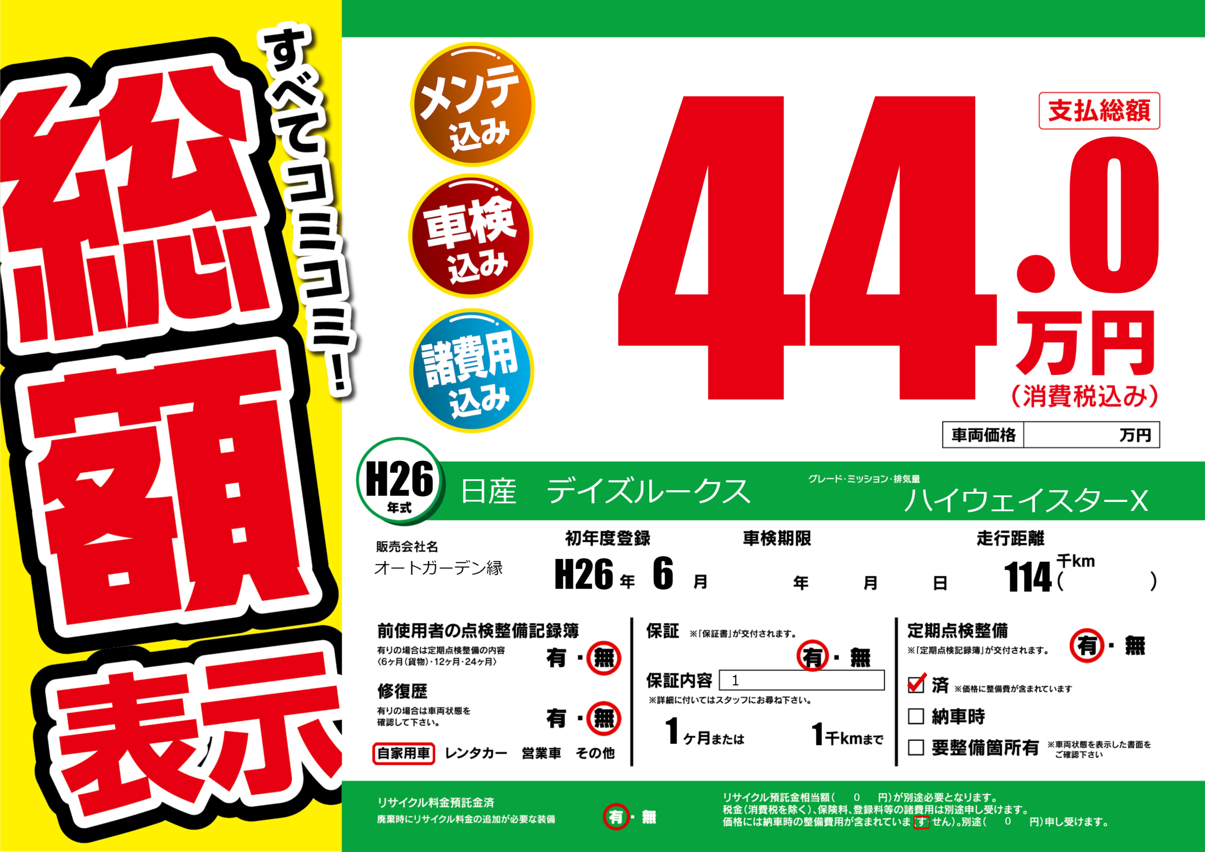 | 定期点検整備 | 定期点検整備あり 定期点検整備済み | ||