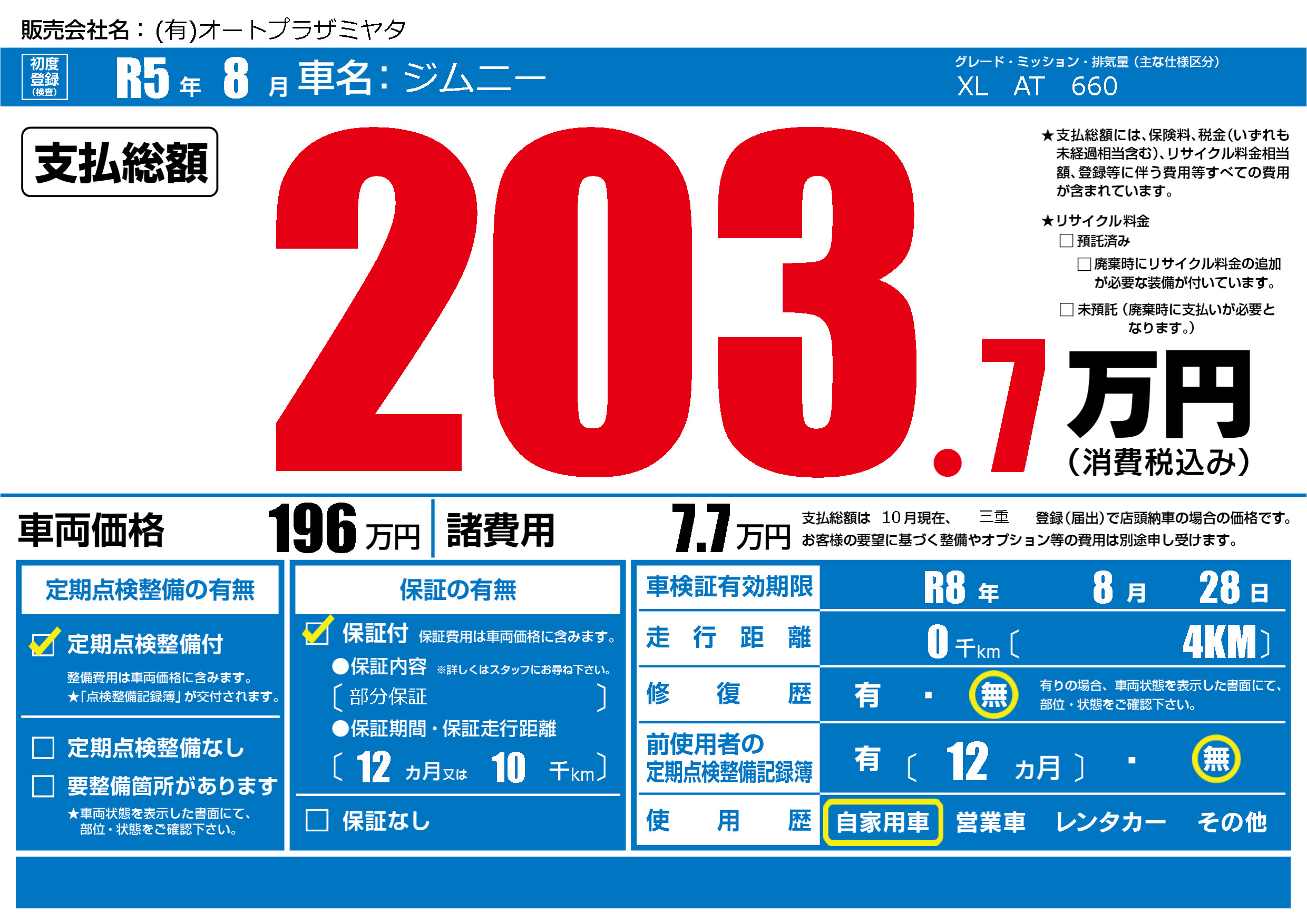 | 車名 | ジムニー | グレード ミッション 排気量 |