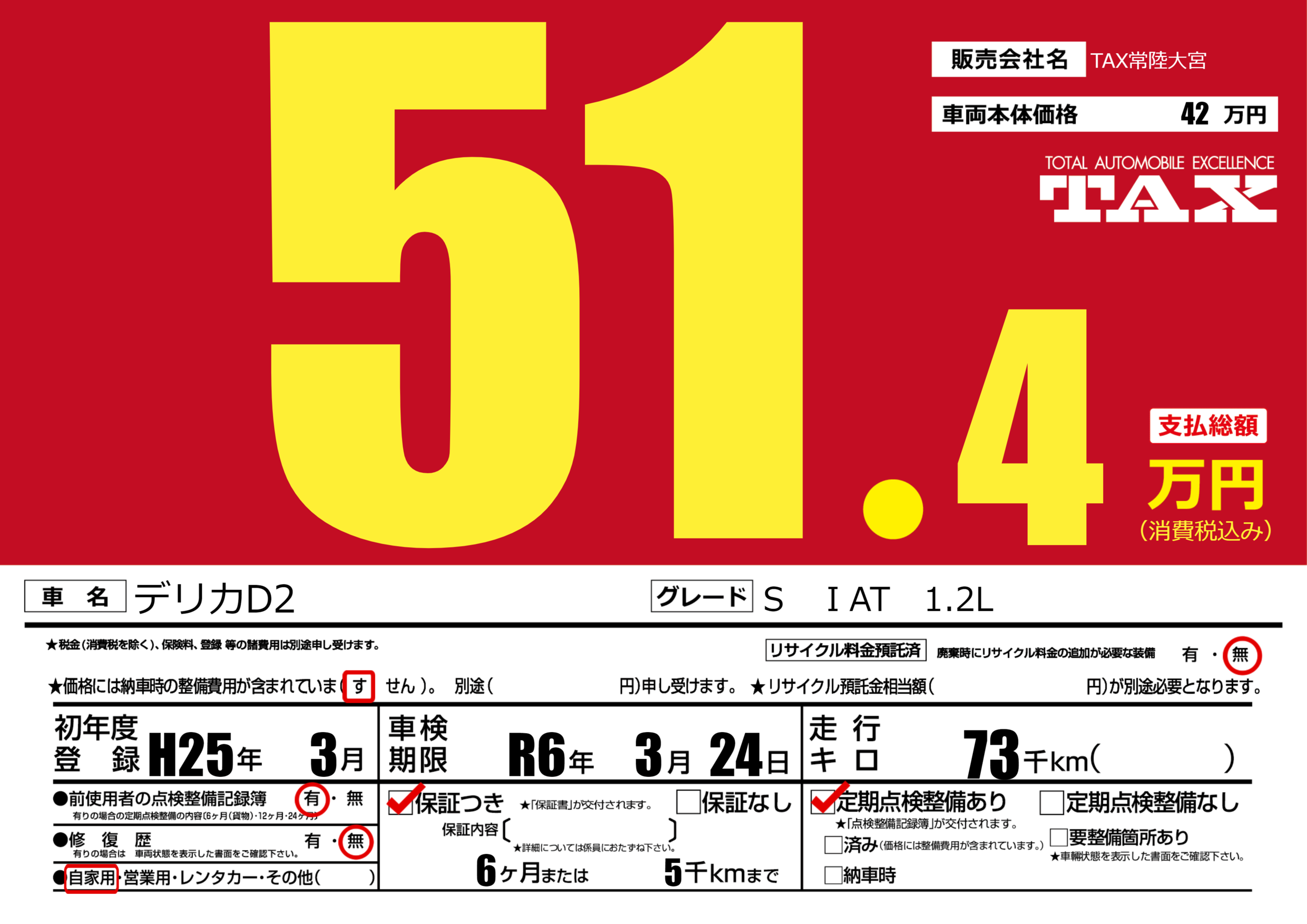 | 車名 | デリカD2 | グレード ミッション 排気量 |