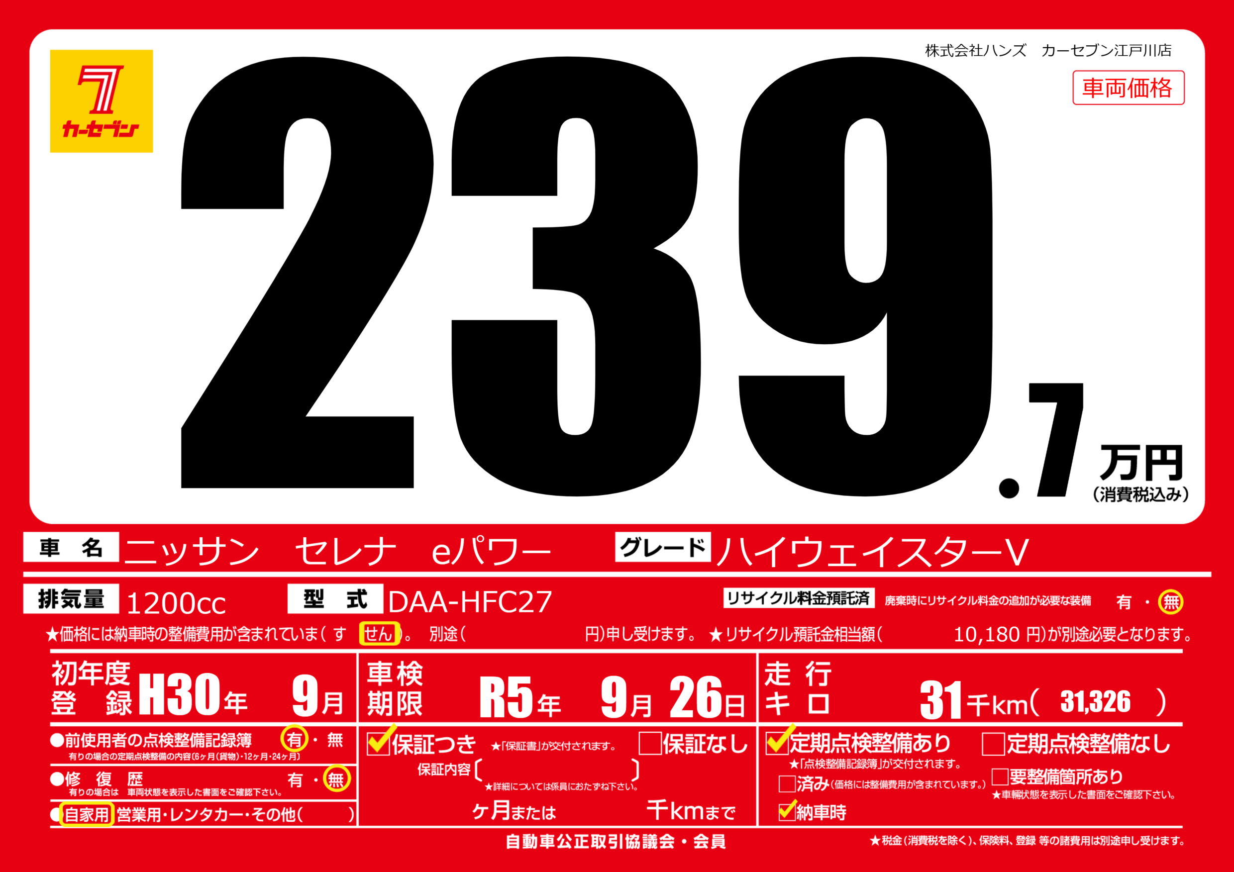 なし | 車検制限 | R5年9月26月 |