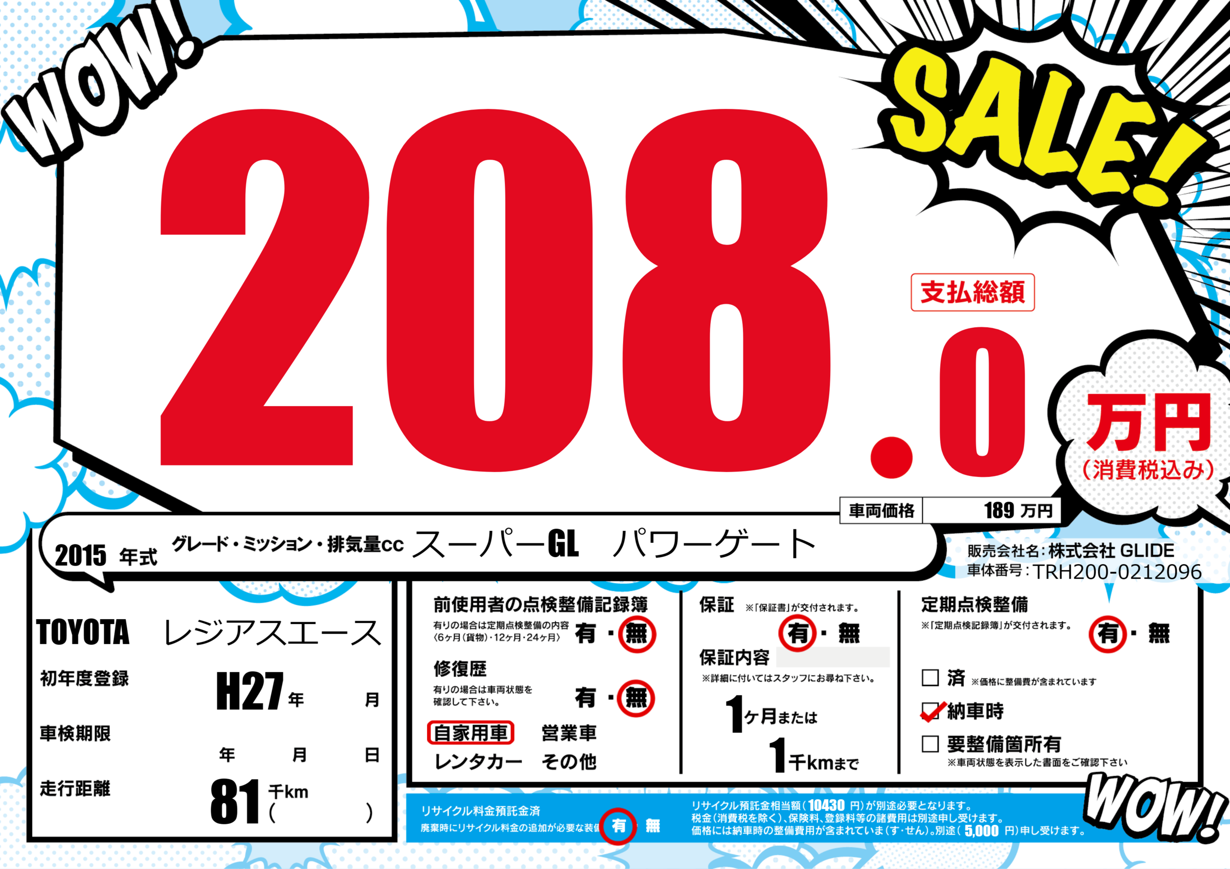| 車名 | TOYOTA レジアスエース | グレード ミッション 排気量 |