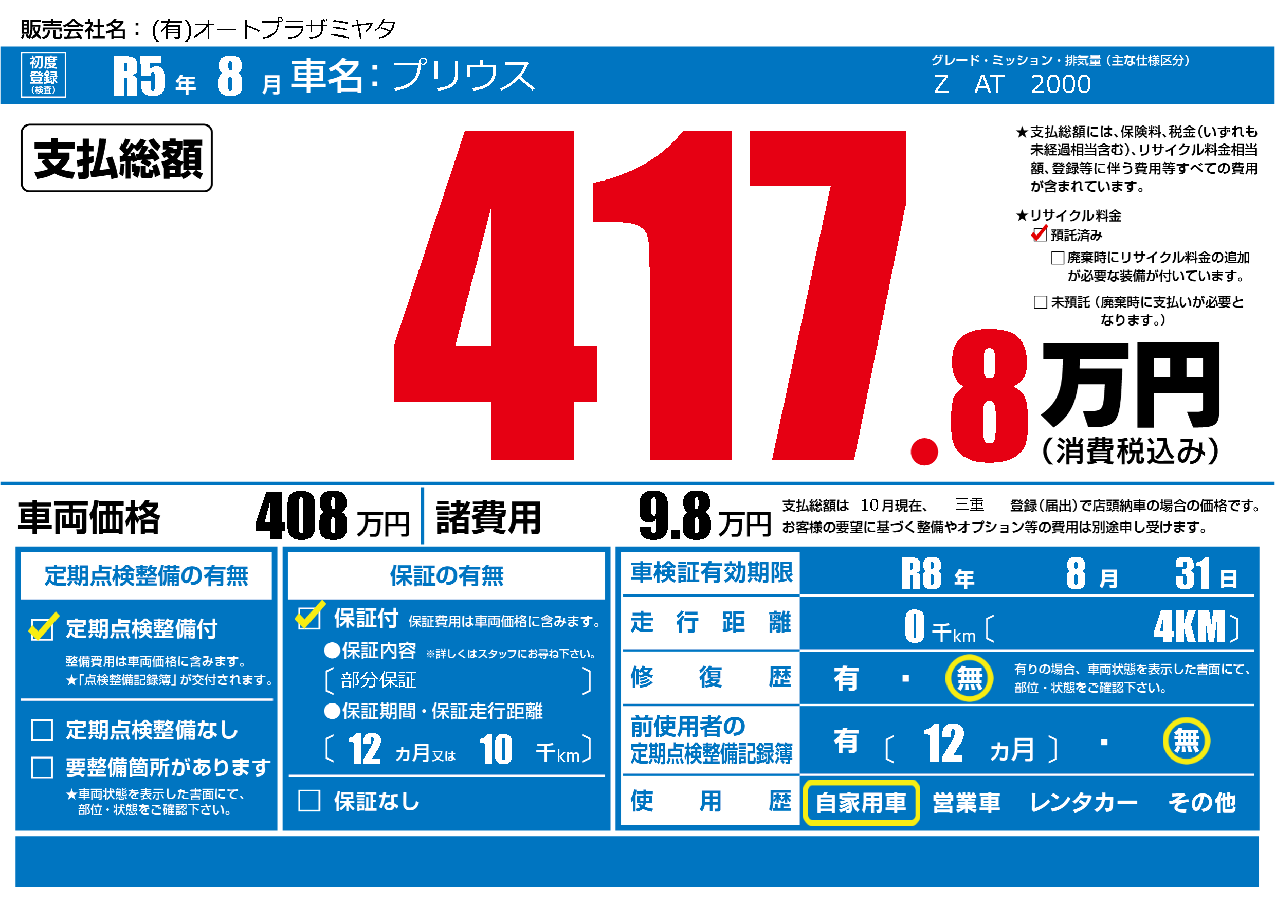 | 車名 | プリウス | グレード ミッション 排気量 |