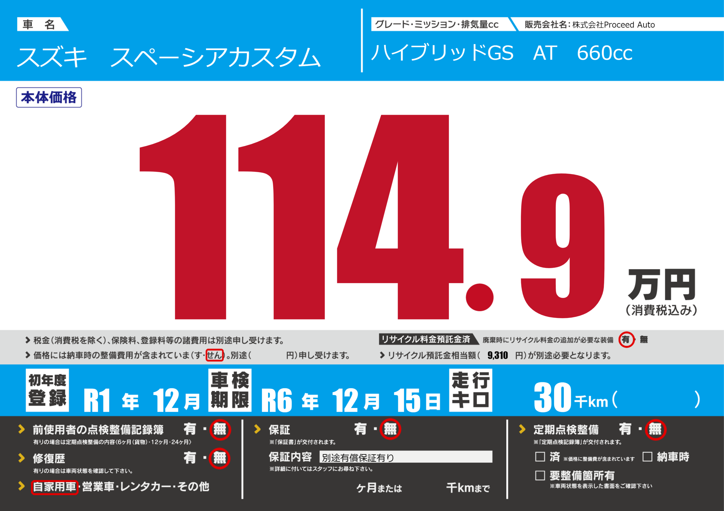 | 走行キロ | 3万km | 初年度登録 | R1年12月 |