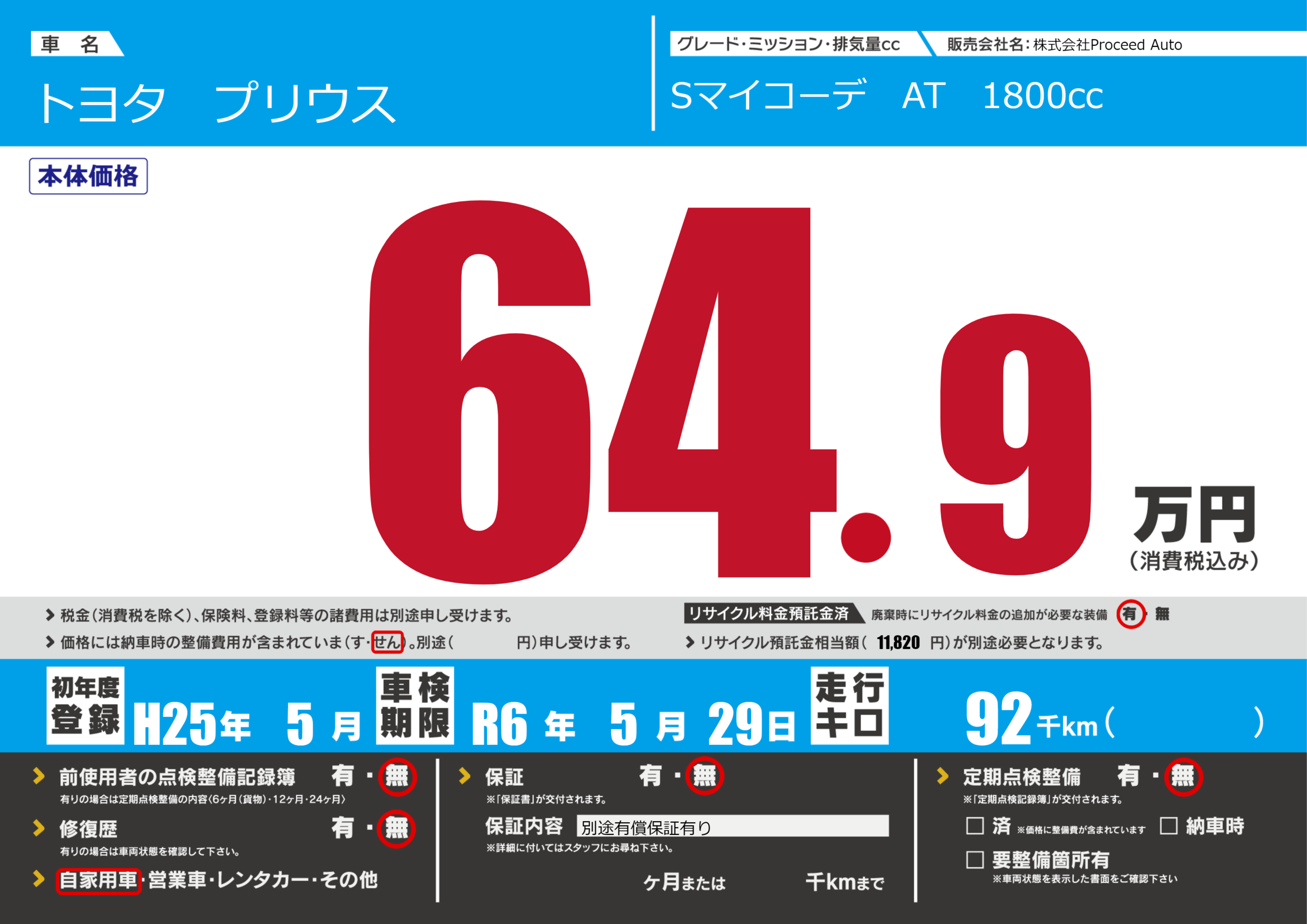| 車名 | トヨタ プリウス | グレード ミッション 排気量 |