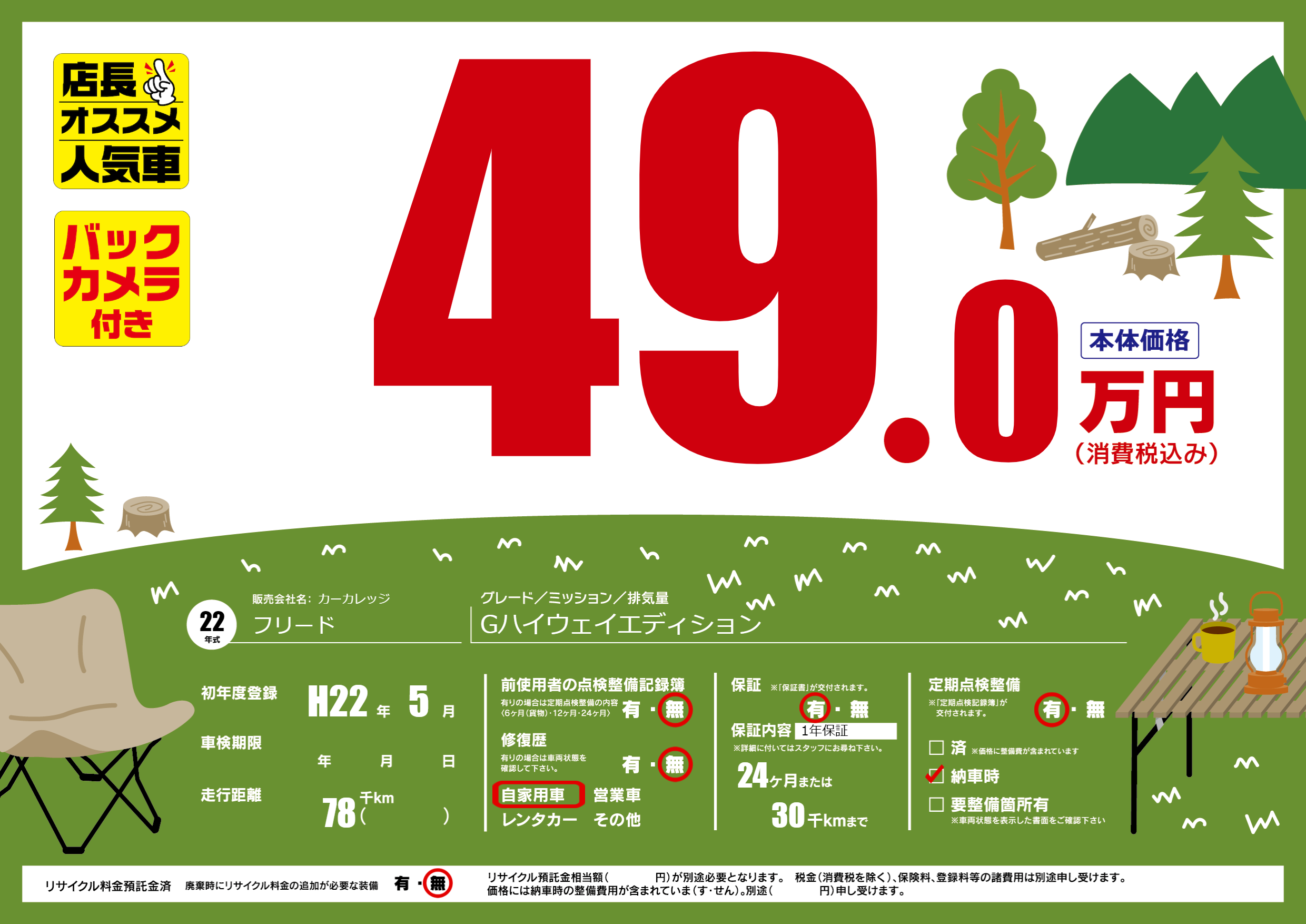 | 走行キロ | 7.8万km | 初年度登録 | H22年5月 |