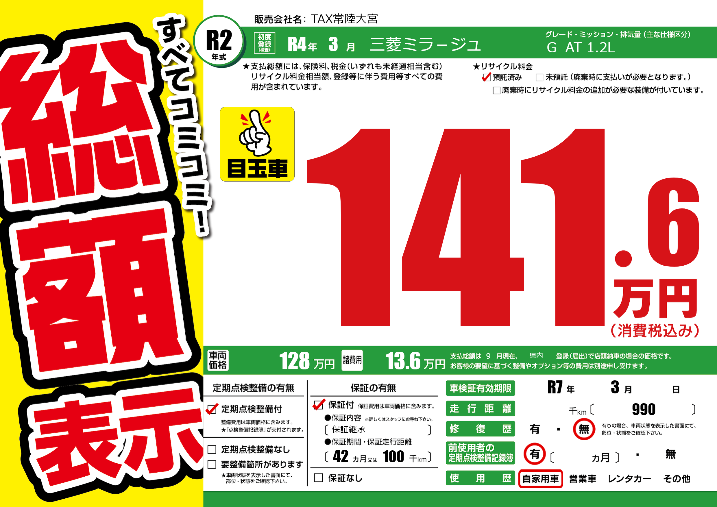 保証付き 保証内容(保証継承) 42ヶ月または(100)千kmまで |