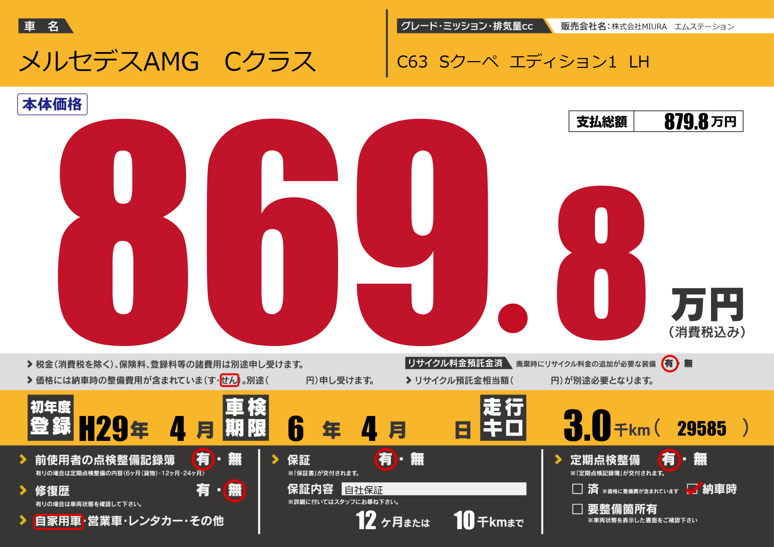 | 車名 | メルセデスAMG Cクラス | グレード ミッション 排気量 |