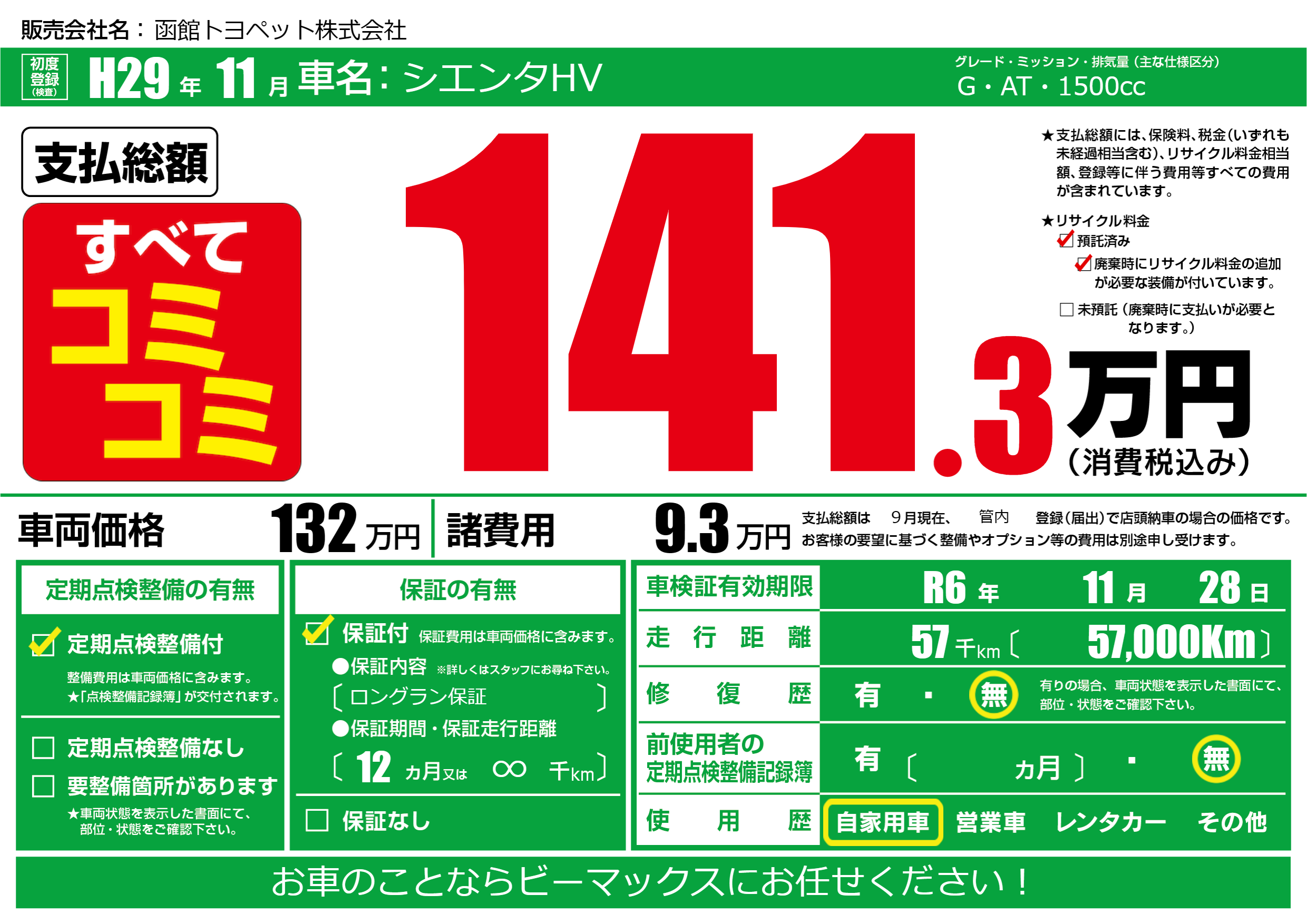| 車名 | シエンタHV | グレード ミッション 排気量 |