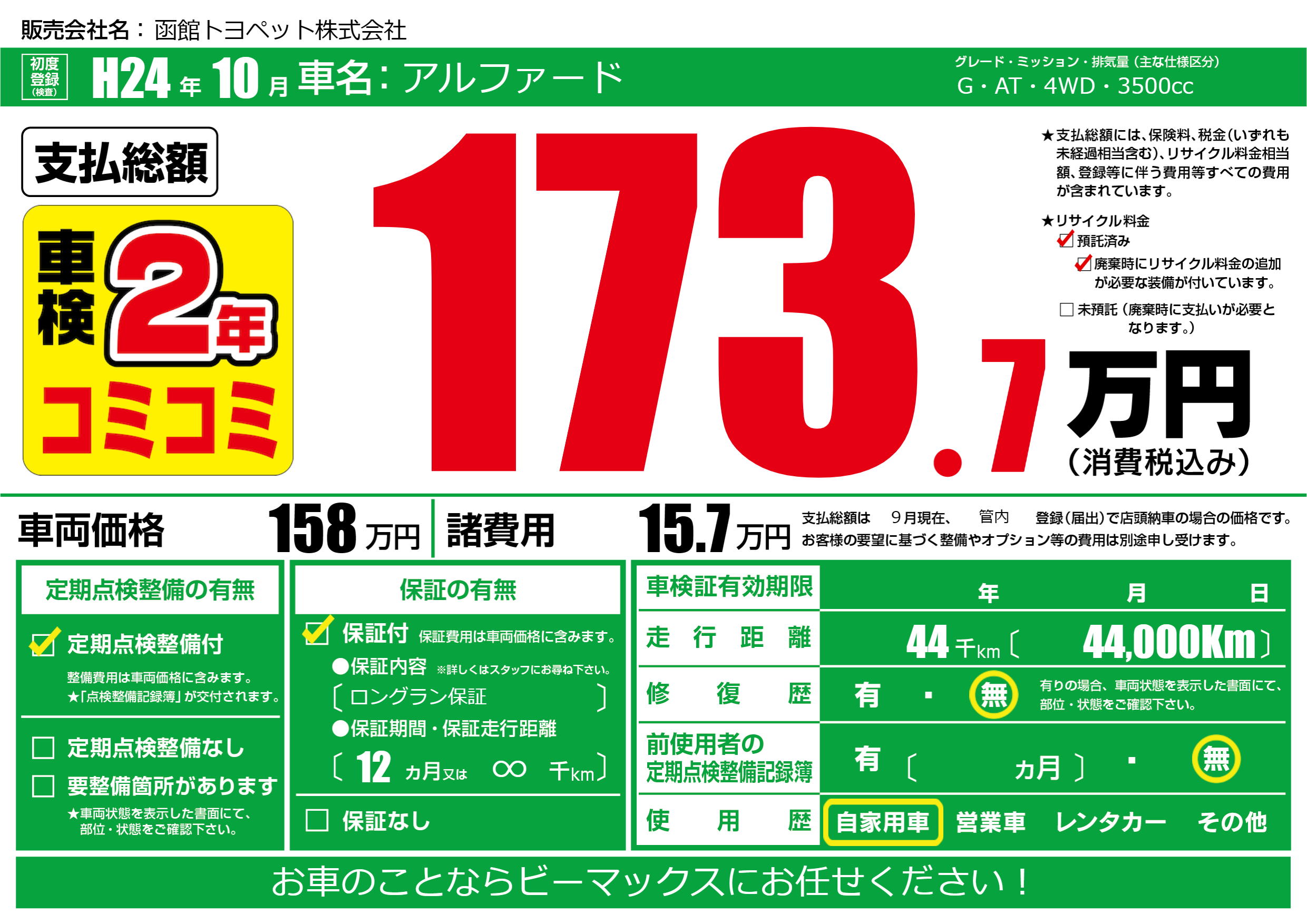 | 車名 | アルファード | グレード ミッション 排気量 |