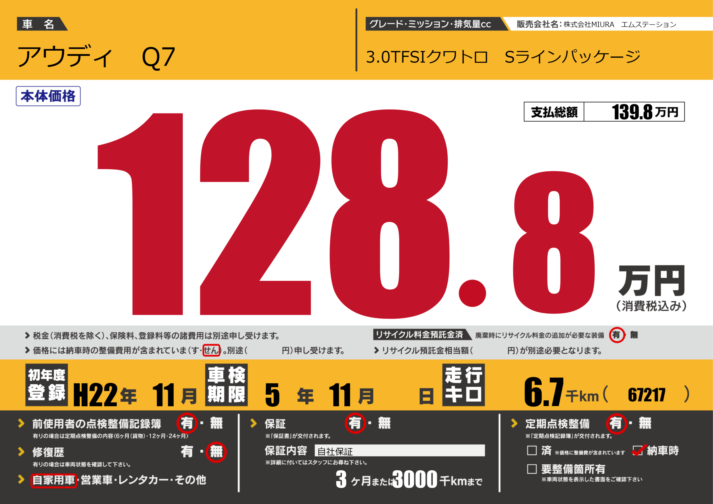 保証付き 保証内容(自社保証) 3ヶ月または3000千km |