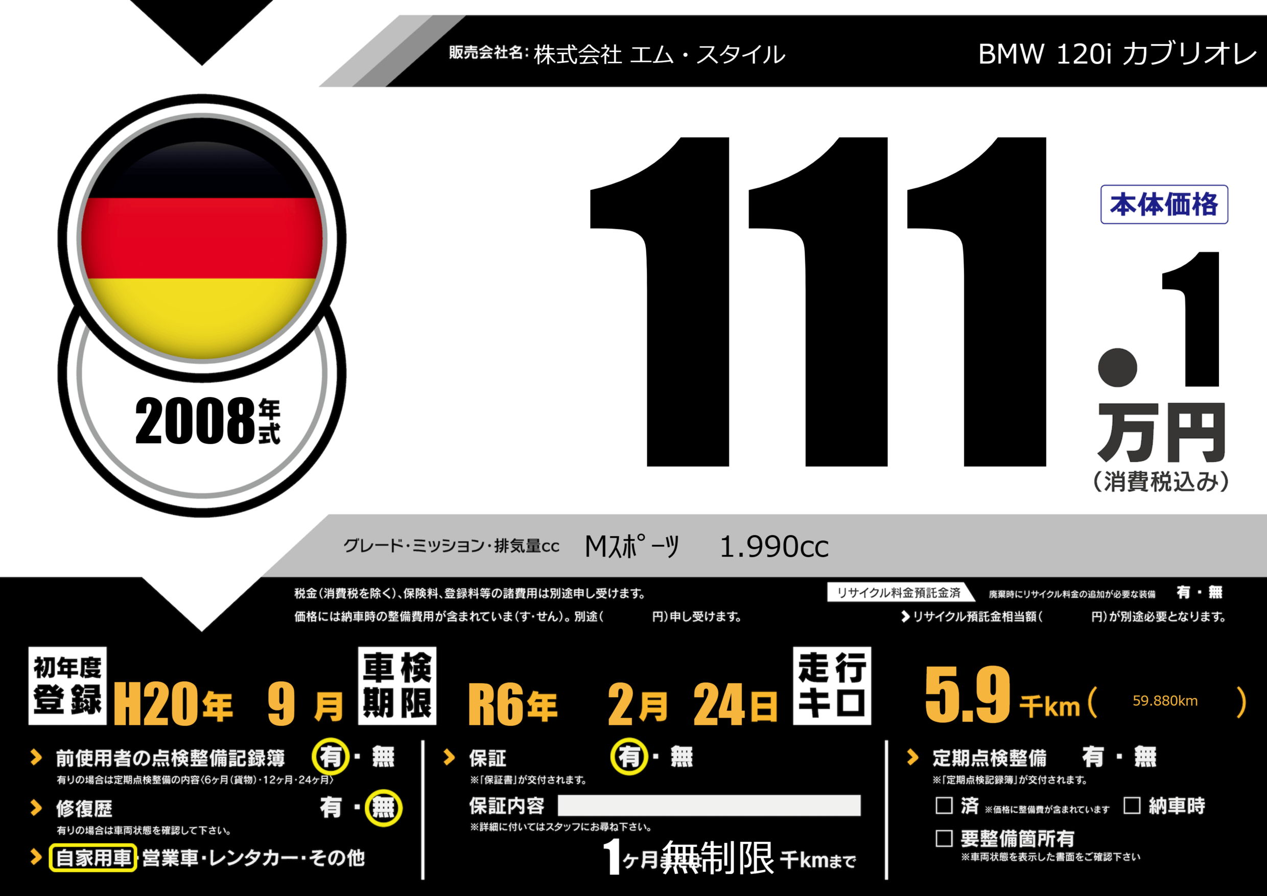 | 車名 | BMW 120i カブリオレ | グレード ミッション 排気量 |
