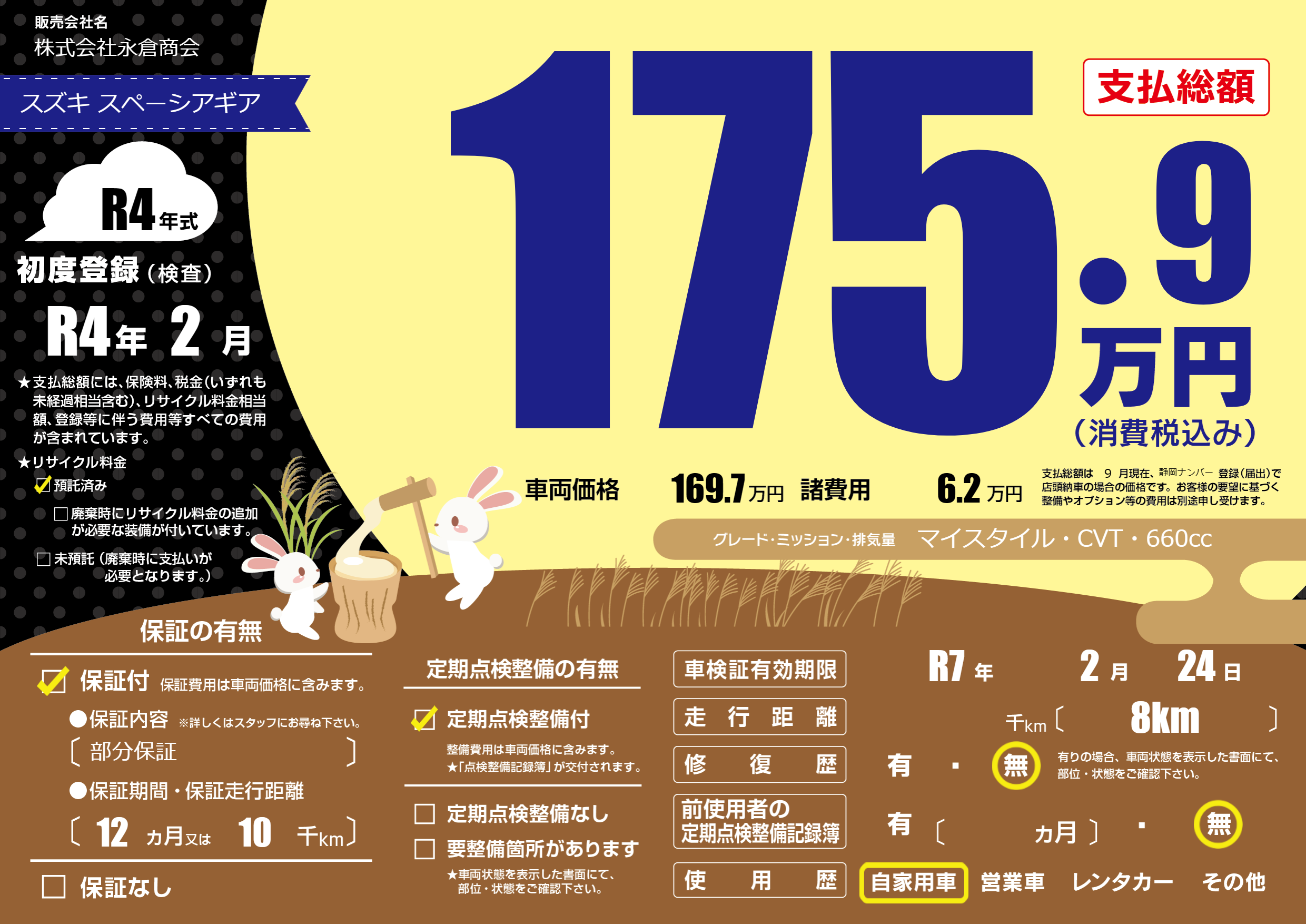 | 車名 | スズキ スペーシアギア | グレード ミッション 排気量 |