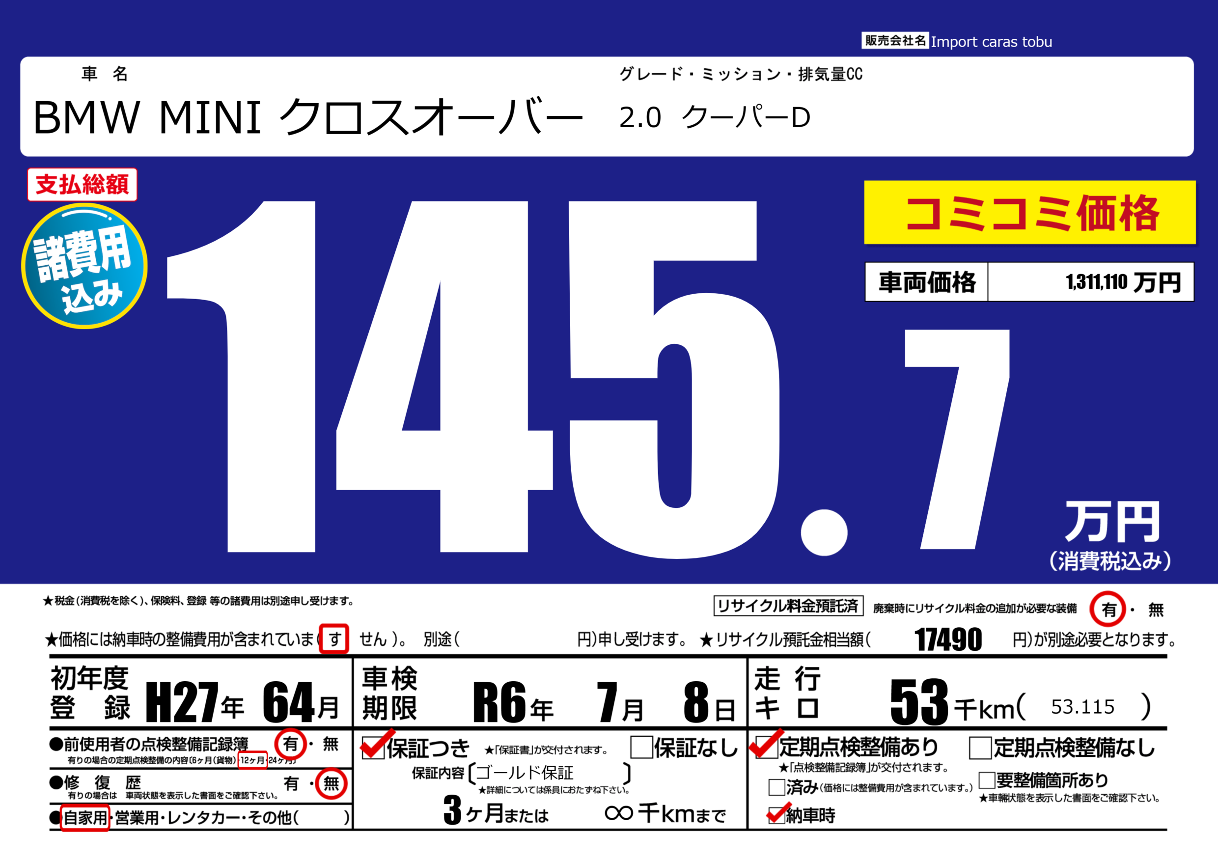 定期点検整備 定期点検整備あり 納車時あり