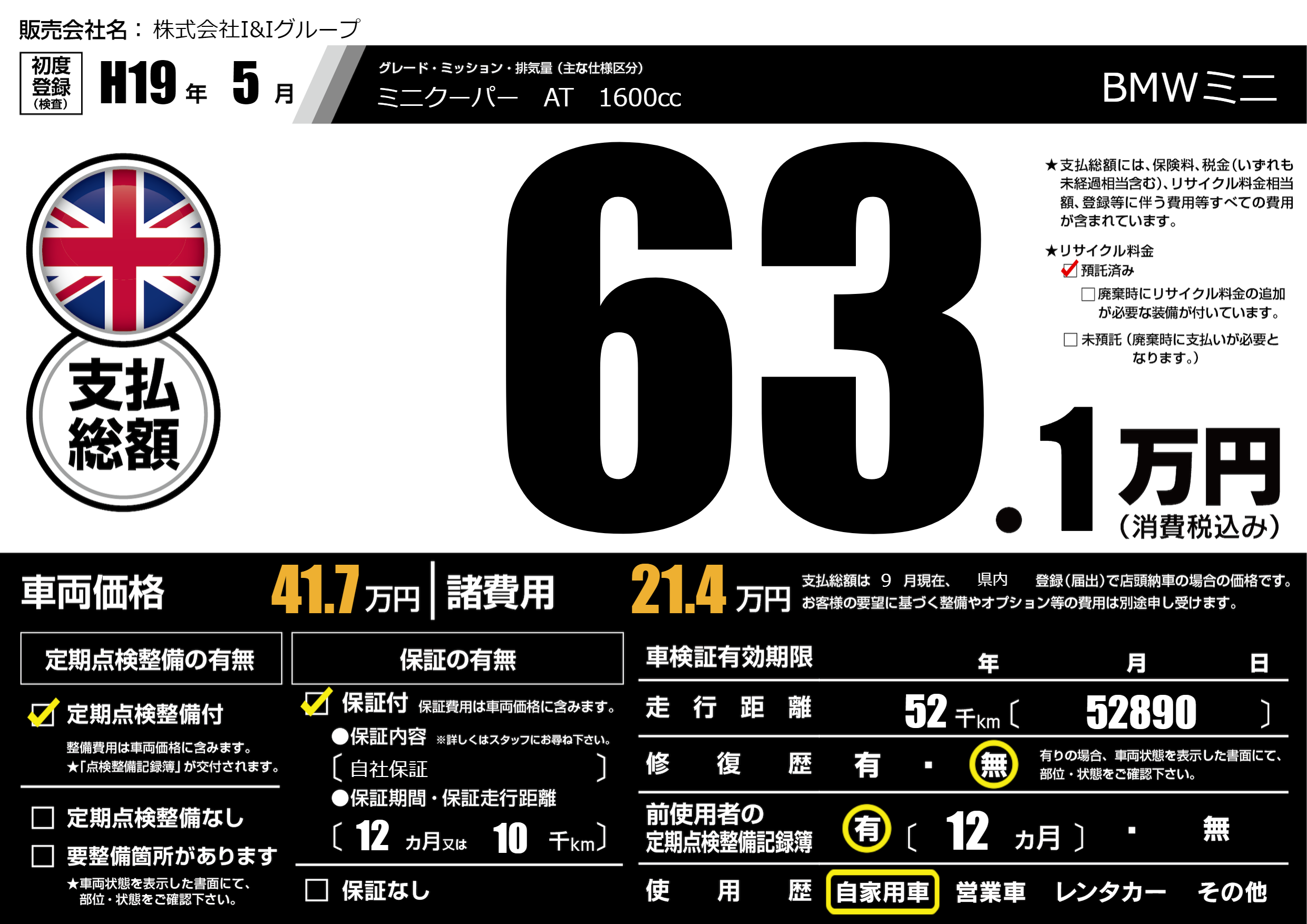 | 車名 | ミニクーパー AT 1600㏄ | グレード ミッション 排気量 |