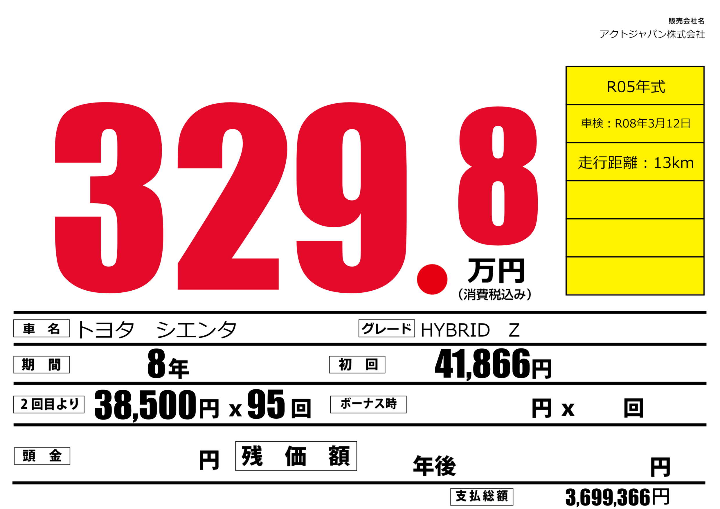 | 車名 | トヨタ シエンタ | グレード ミッション 排気量 |
