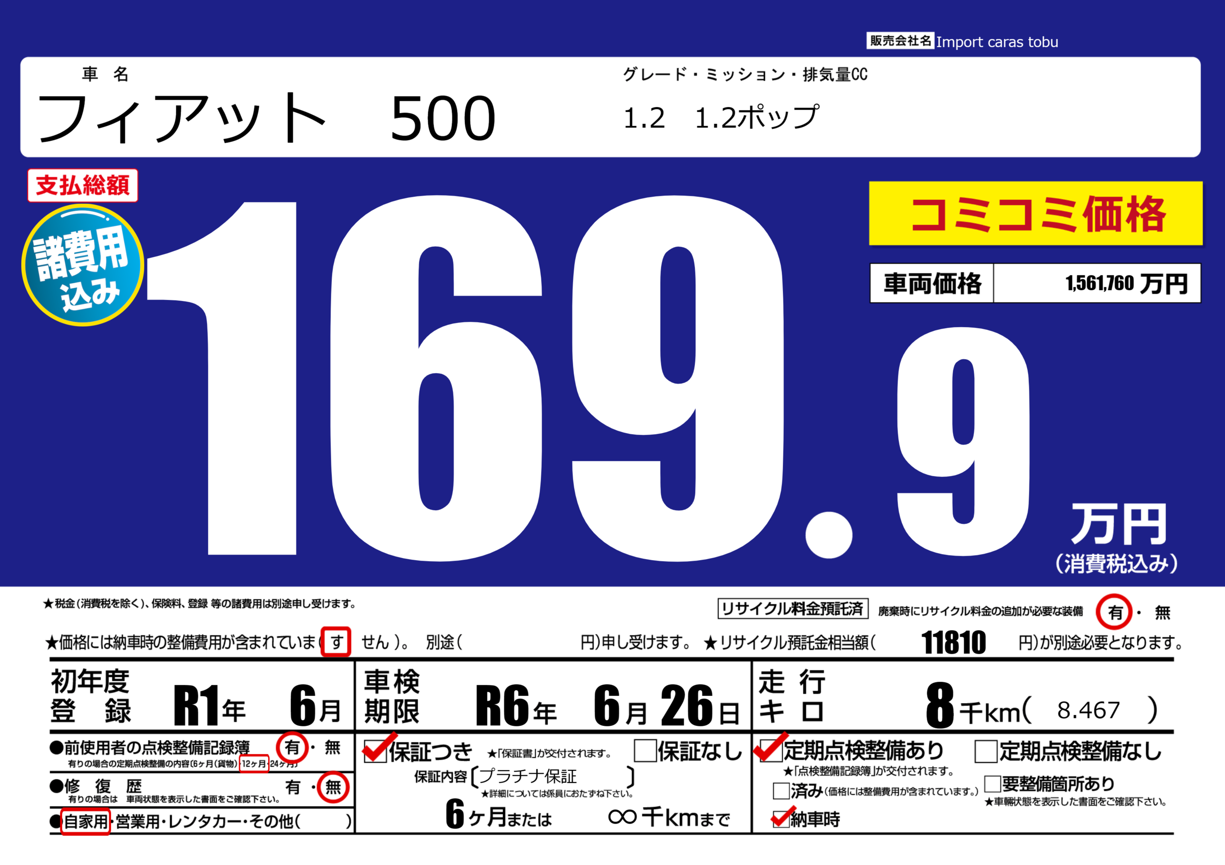 | 車名 | フィアット 500 | グレード ミッション 排気量 |