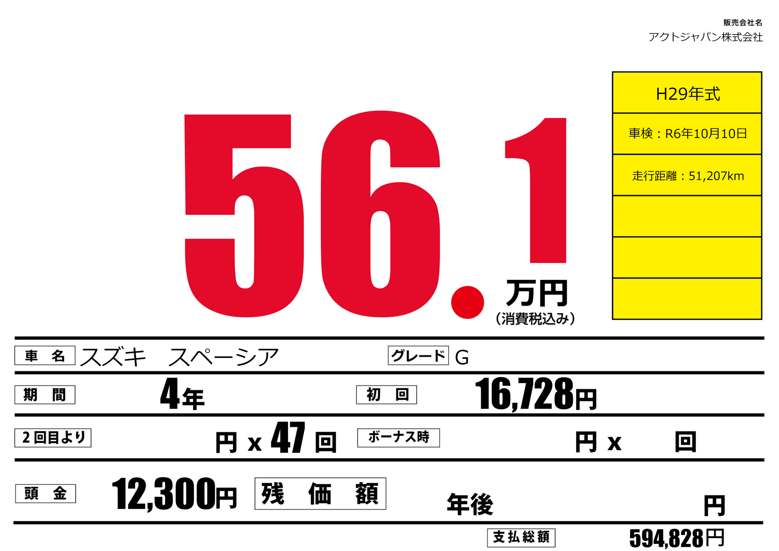 | 車名 | スズキ スペーシア | グレード ミッション 排気量 |