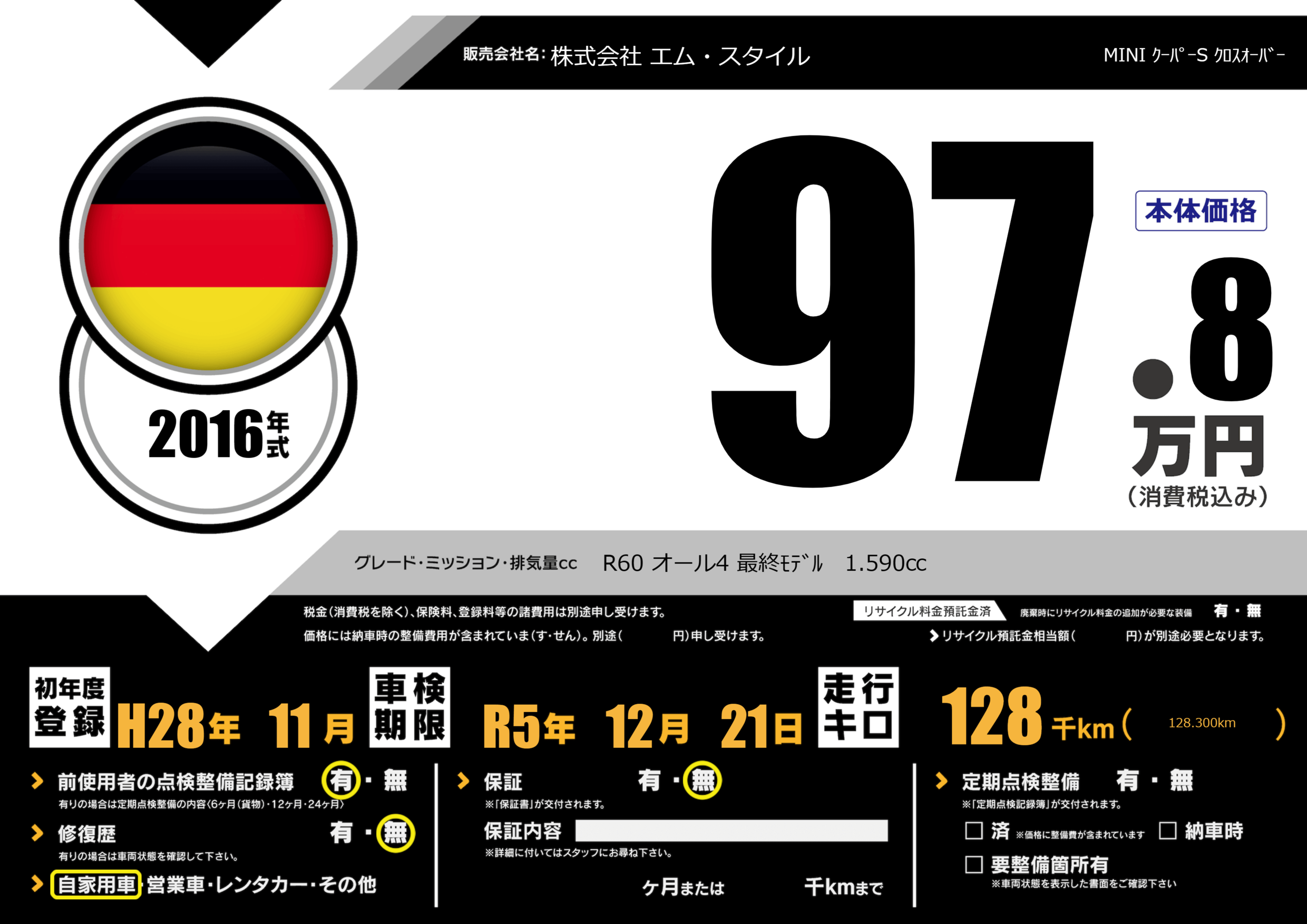 | 車名 | MINI クーパーS クロスオーバー | グレード ミッション 排気量 |