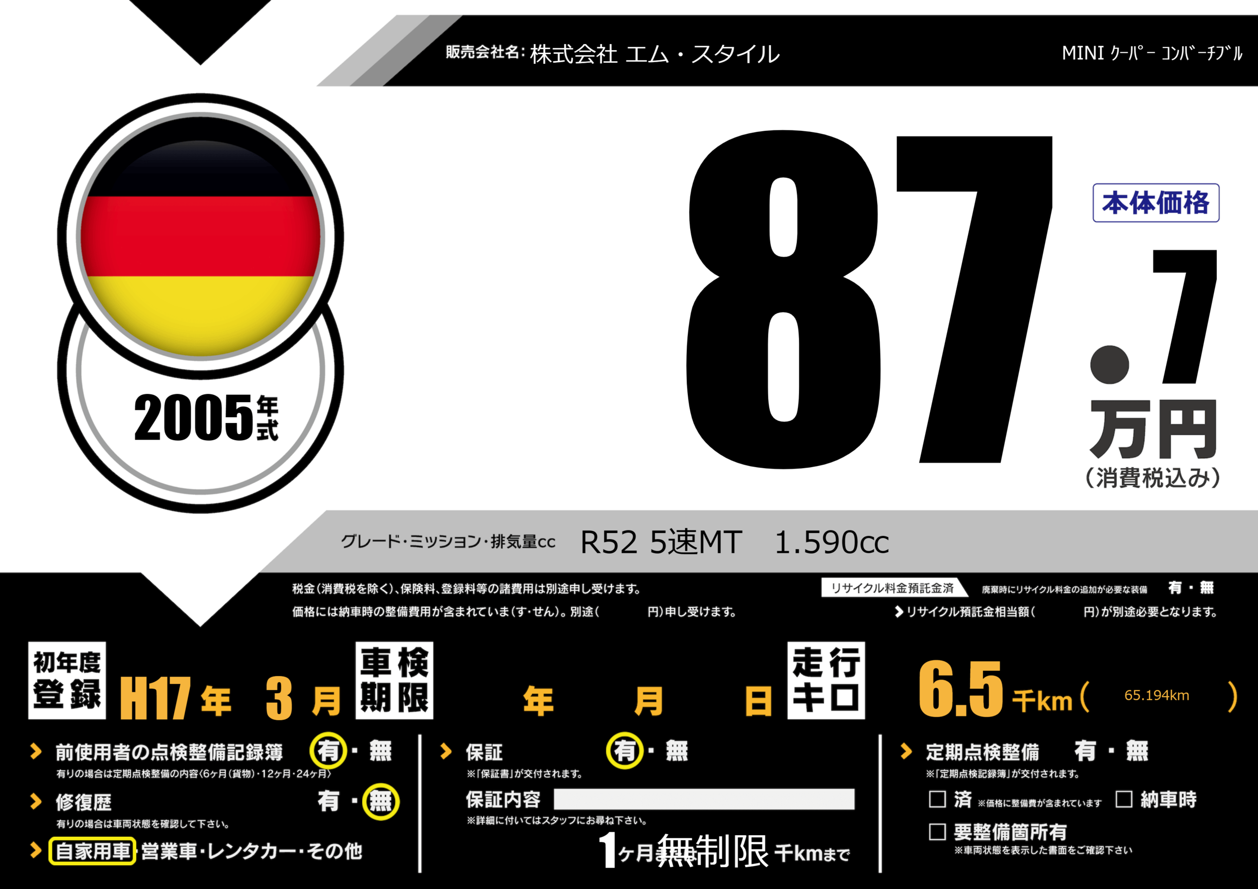 | 車検制限 | - 年 - 月 - 日 | ||