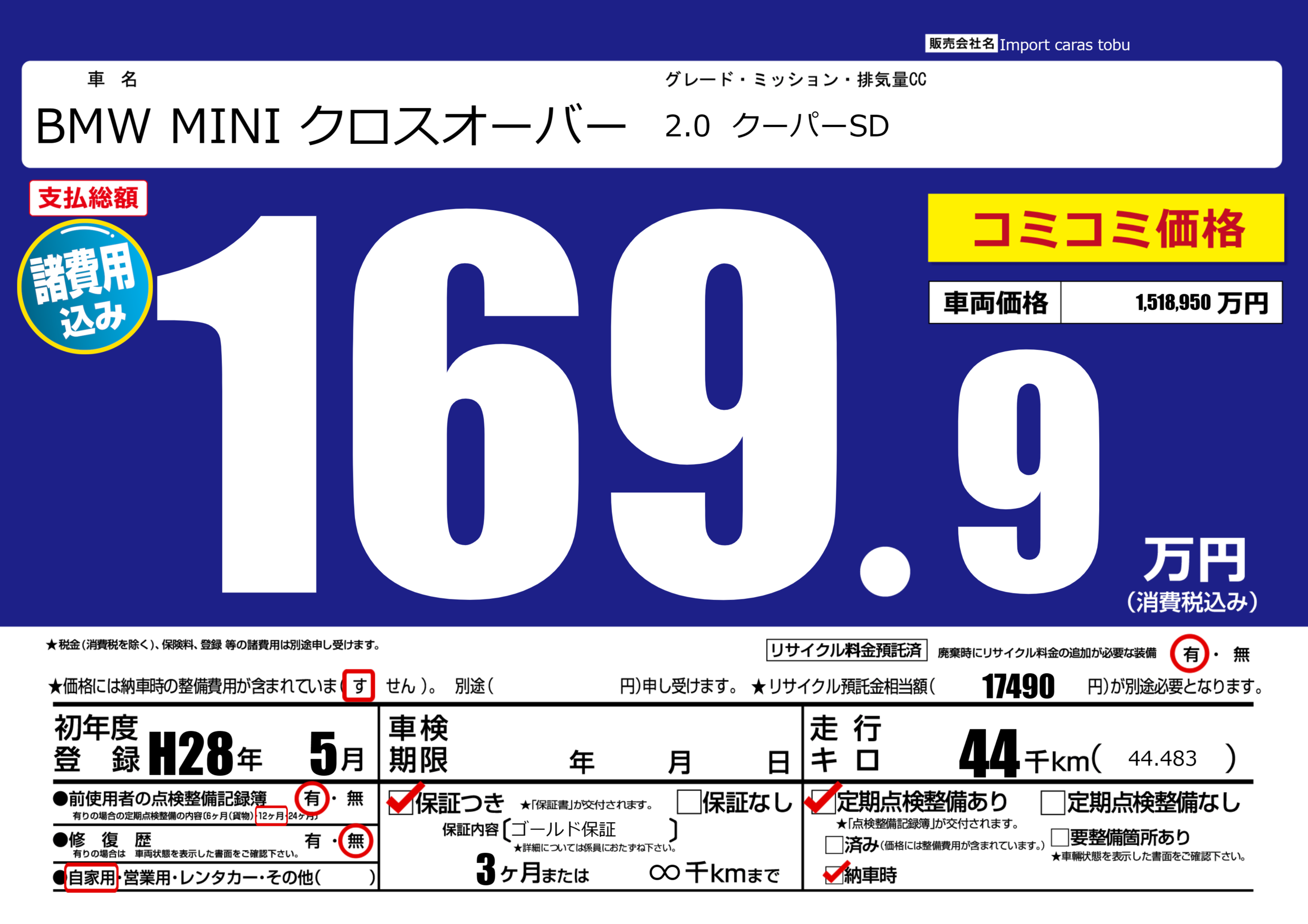 | 車名 | BMW MINI クロスオーバー | グレード ミッション 排気量 |