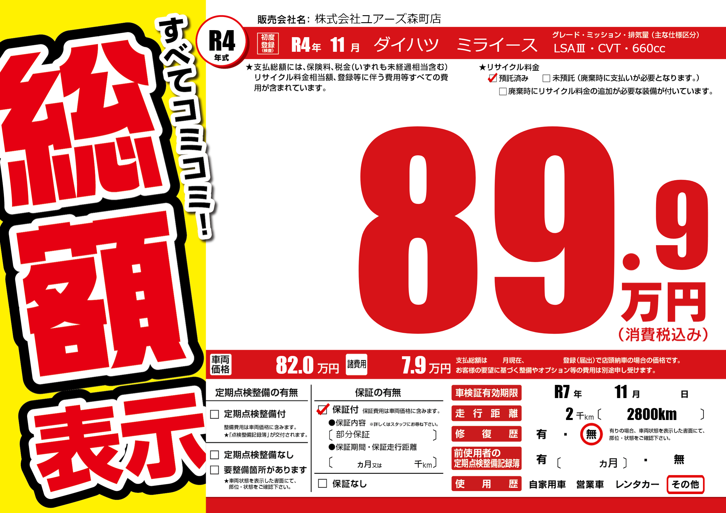 | 車検制限 | R7年 11月 - 日 | ||