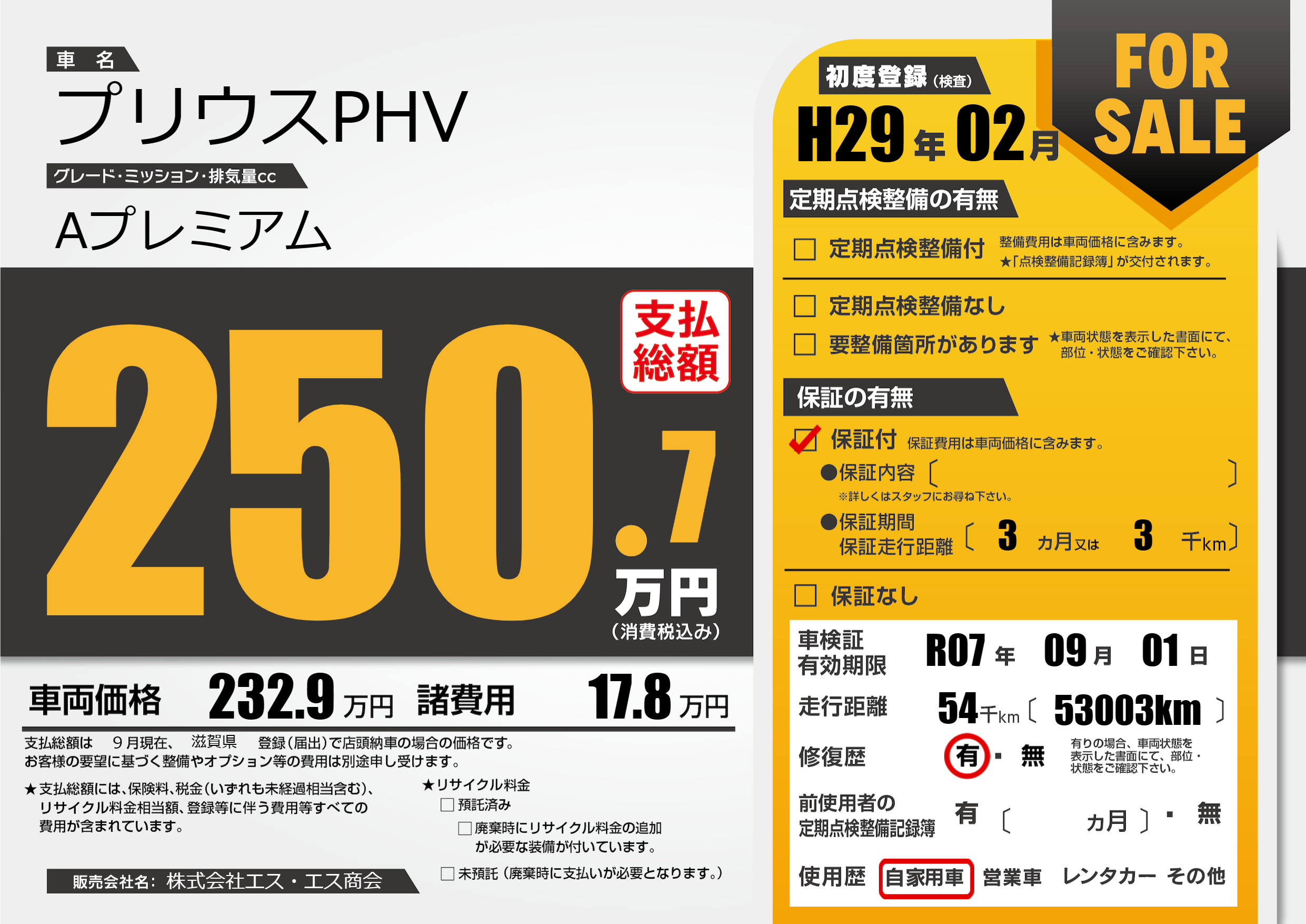 | 車名 | プリウスPHV | グレード ミッション 排気量 |